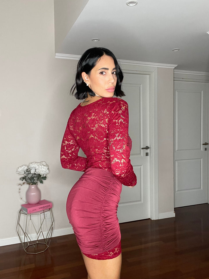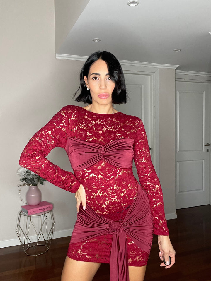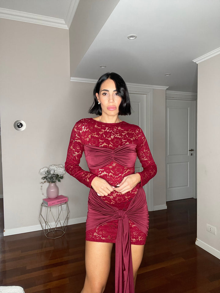 Abito interamente in pizzo con fusciacca regolabile in vita.