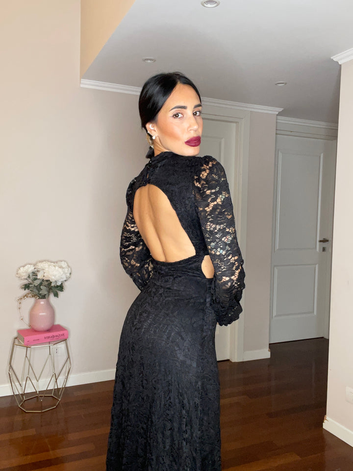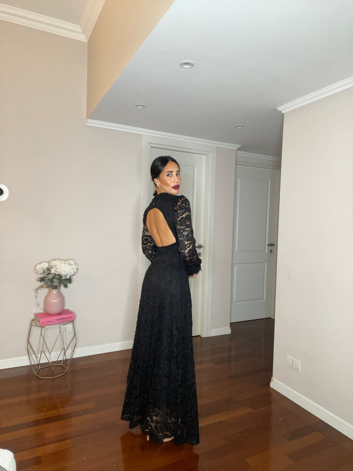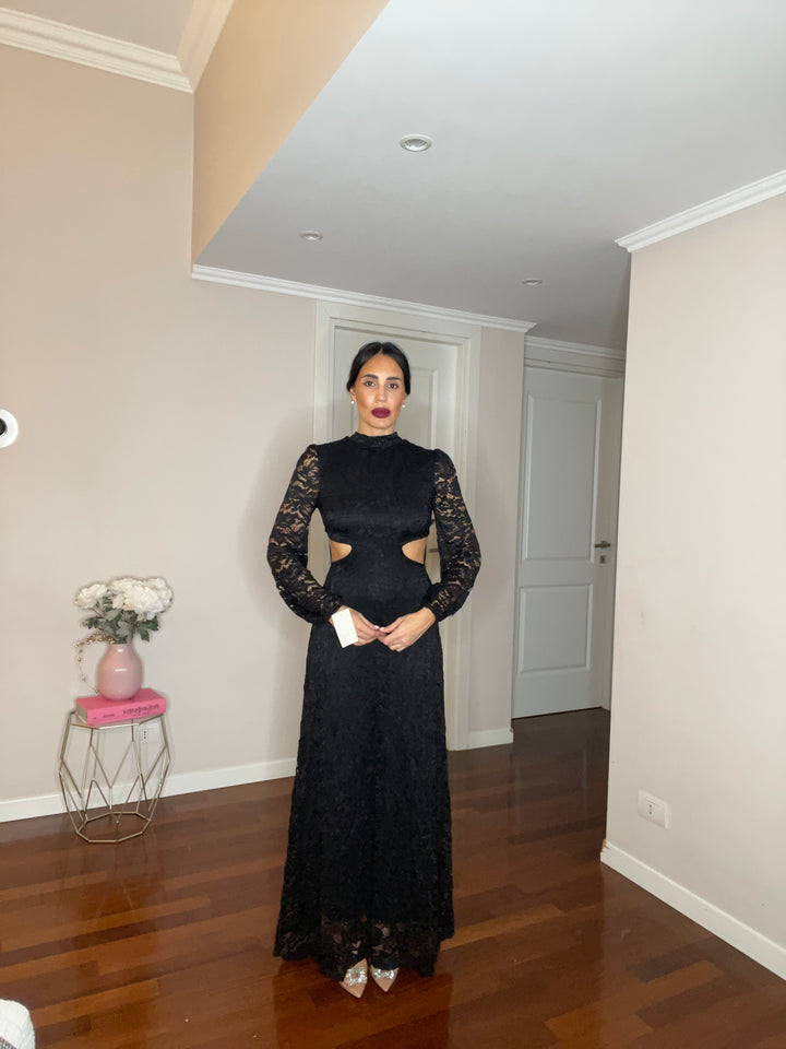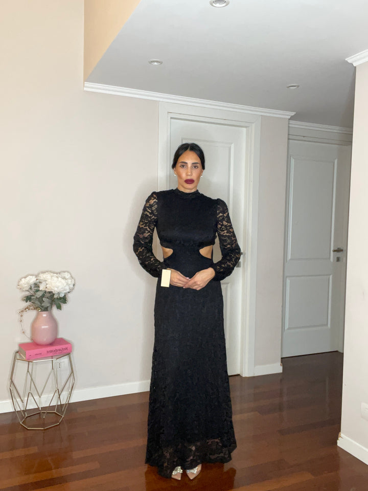 Abito interamente in pizzo con schiena scoperta e aperture sui fianchi.
