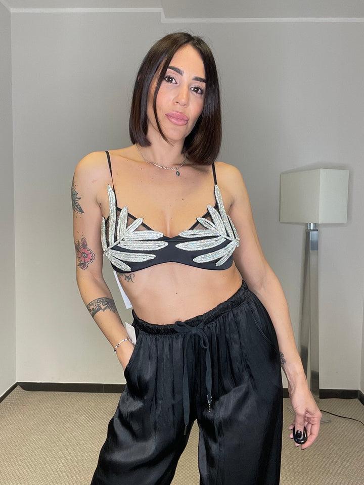 Bralette decorata con foglia ricoperta di strass. Bretelle e regolabili. Chiusura sul retro con gancetti come il reggiseno con 3 diverse misure.