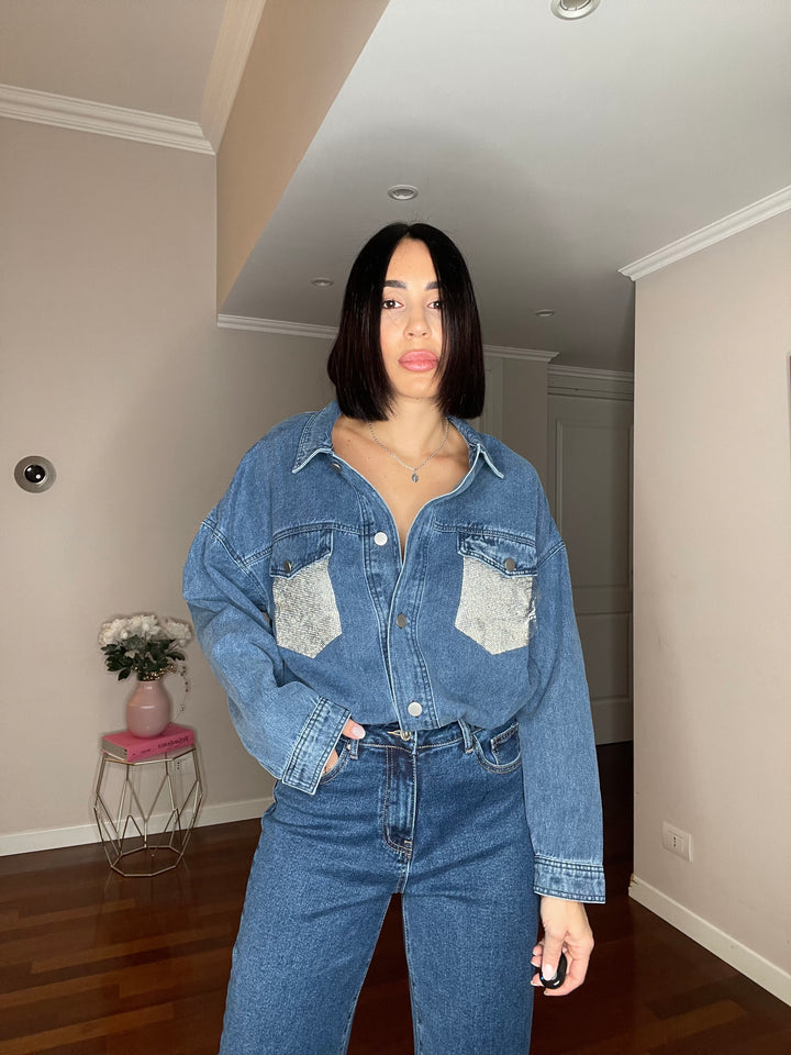 Camicia Denim Blu Tasche Strass