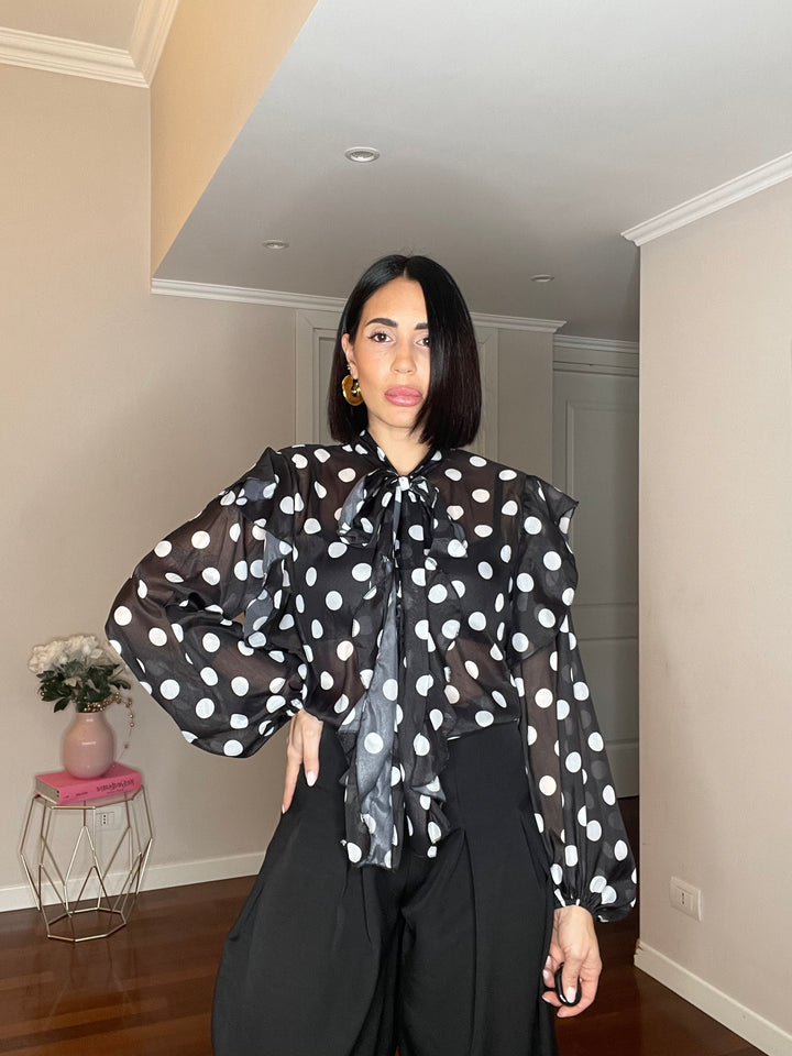 Camicia a pois con bottoni sul davanti e fiocco sul collo.