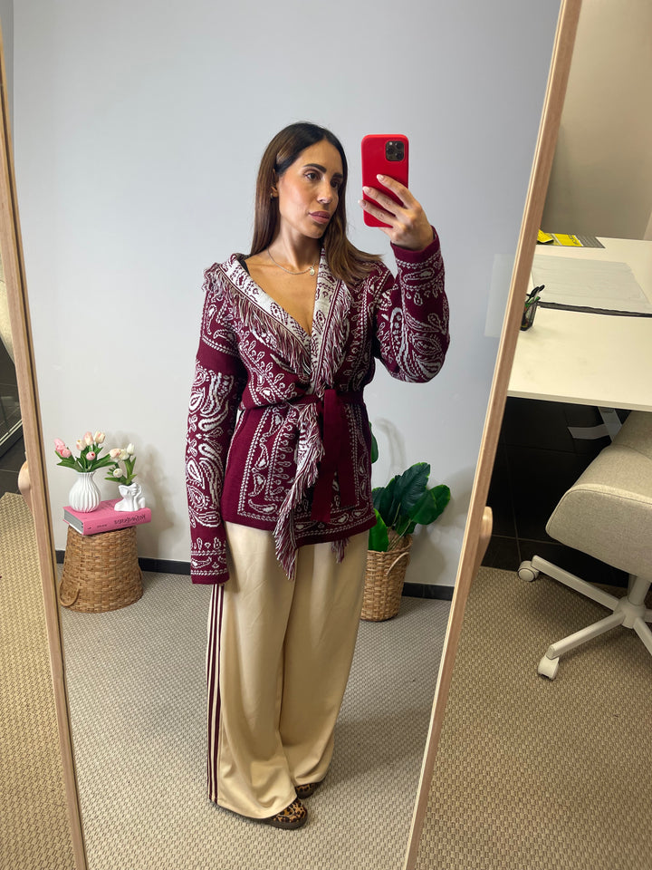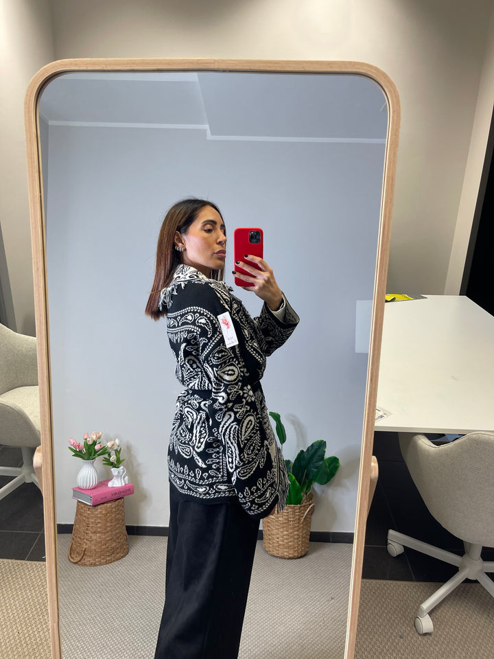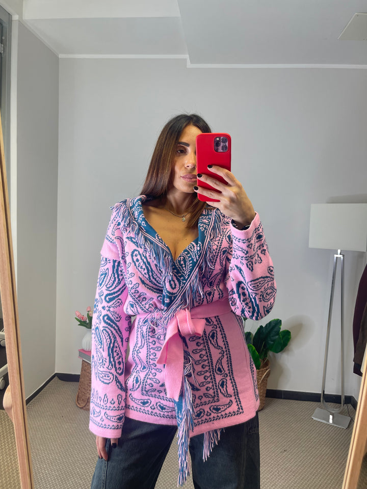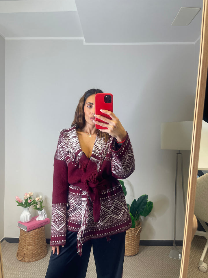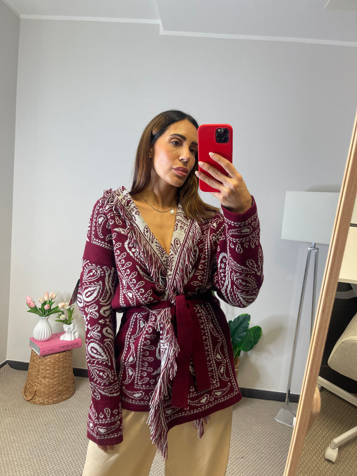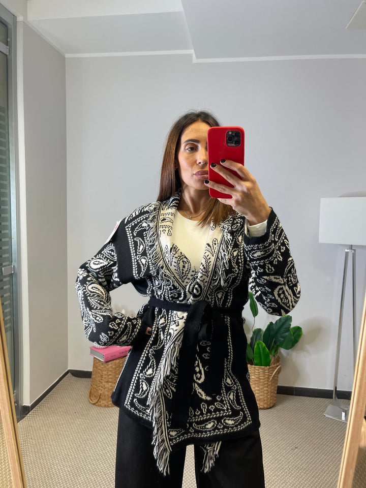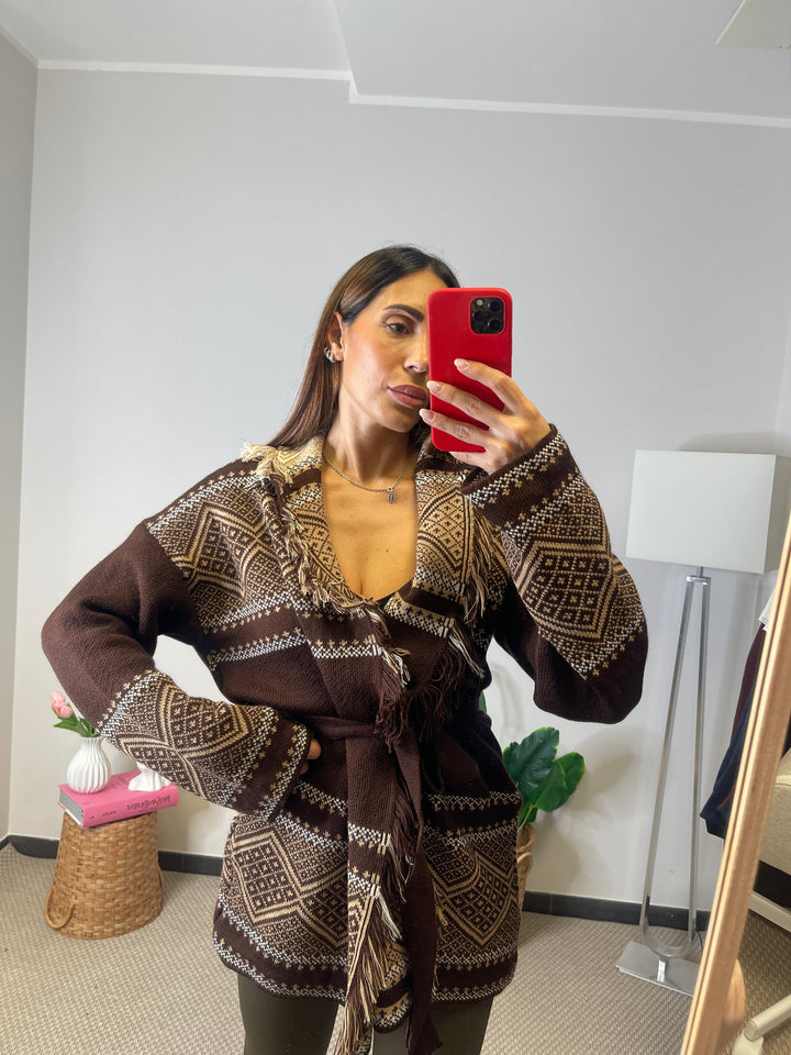 Cardigan lungo con cinturina in vita.