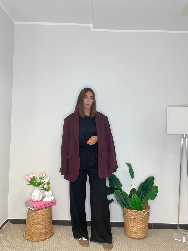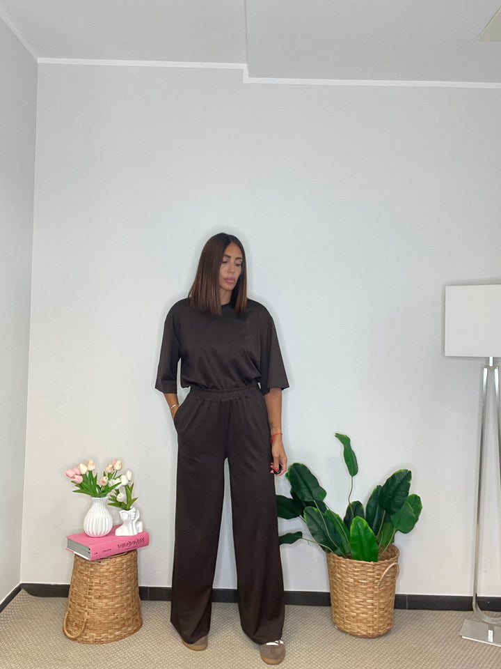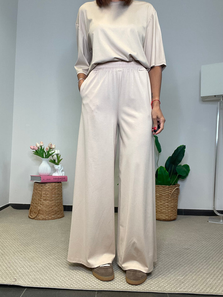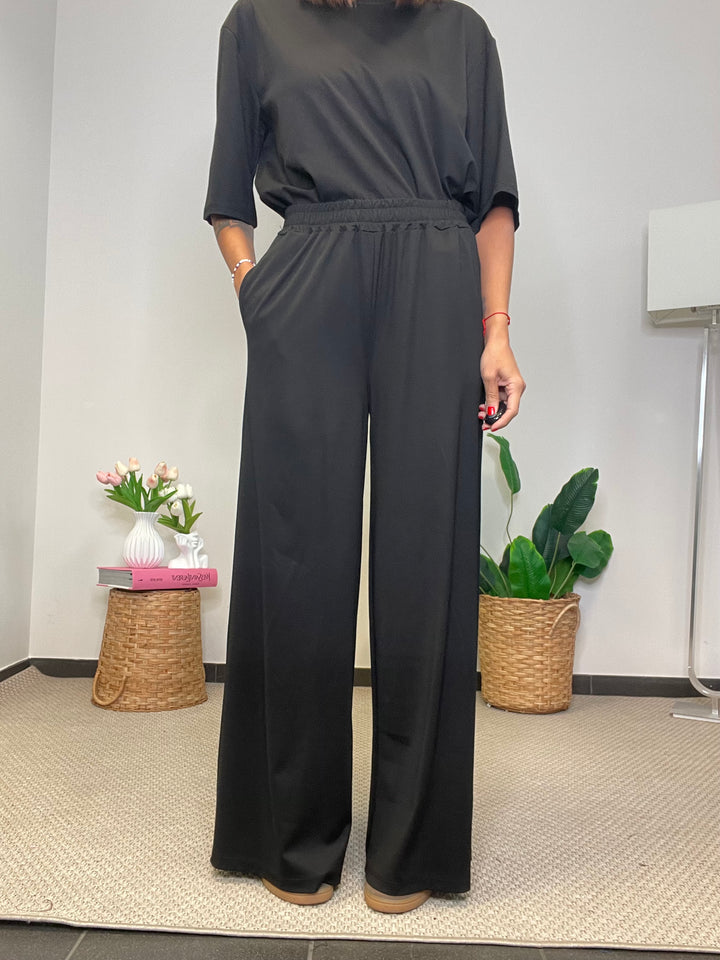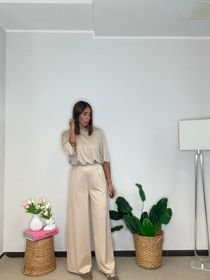 Coordinato in viscosa con elastico in vita. Adatto a tutte le fisicità, pantalone con elastico in vita. Maglia lunghezza regular.