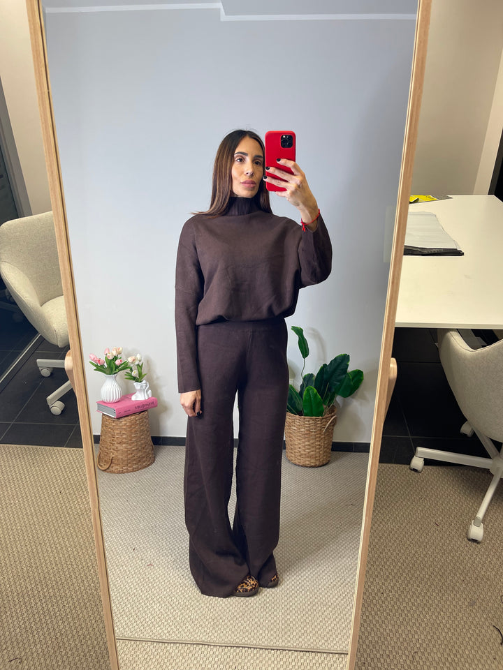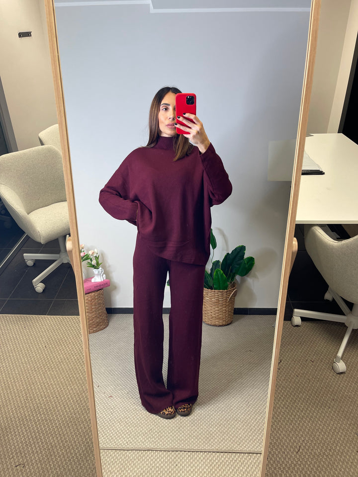 Coordinato in maglia pesante taglia unica, pantalone con elastico in vita. Maglia mezzo collo, lunghezza sotto i fianchi.