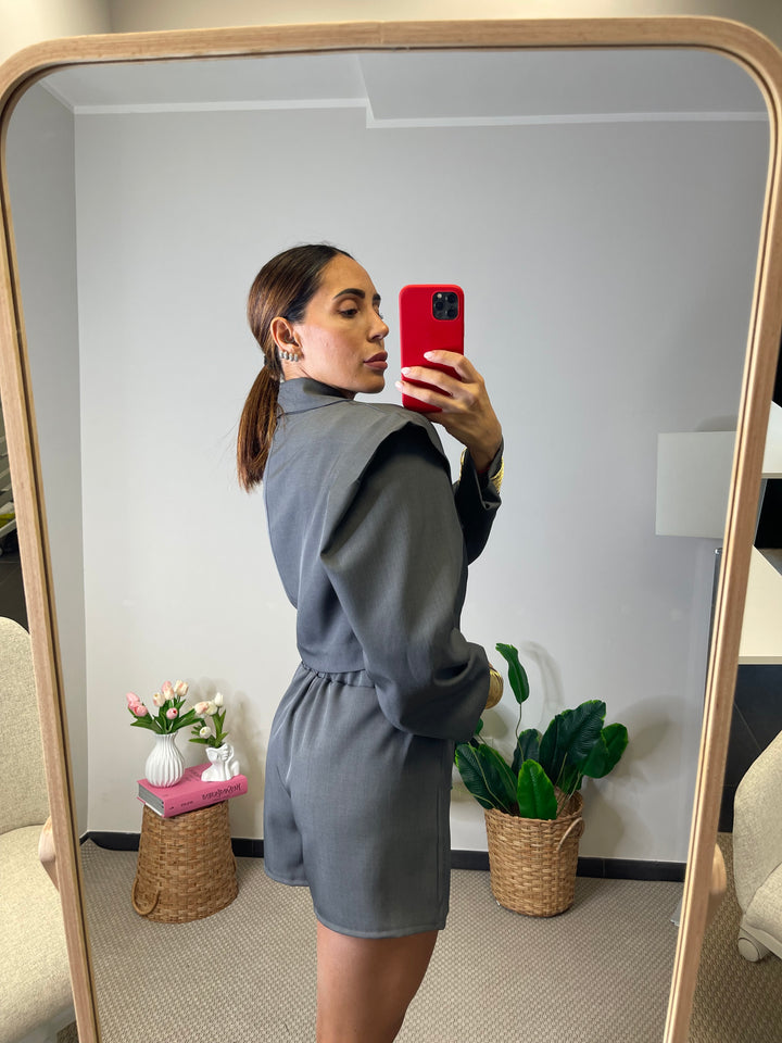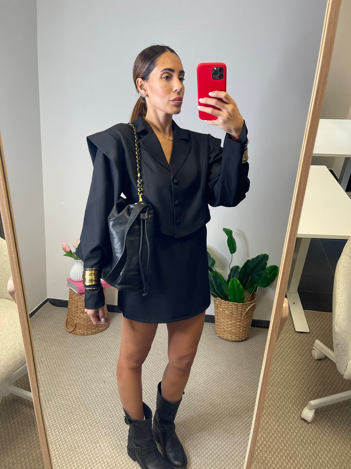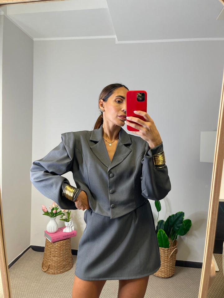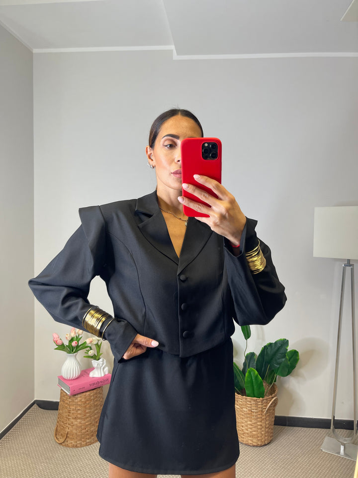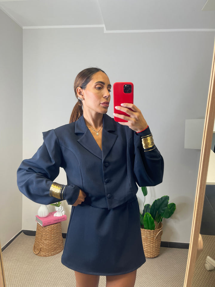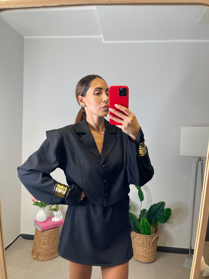 Coordinato con blazer con spalline imbottite e scese. Bottoncini apribili sul davanti.