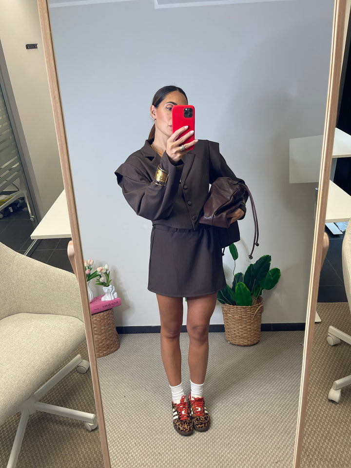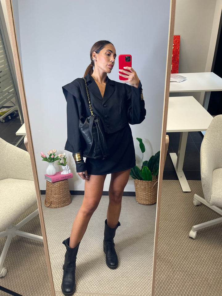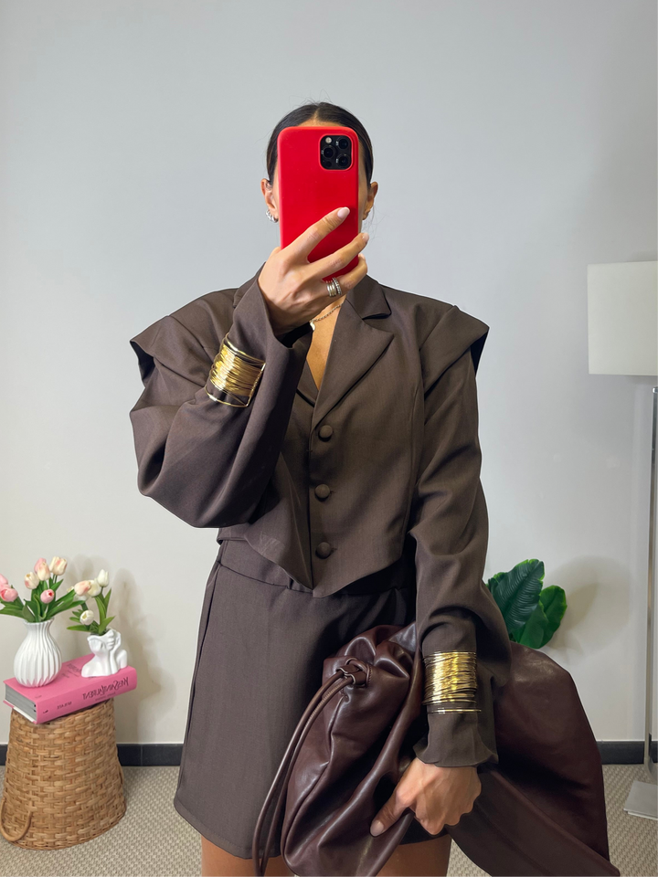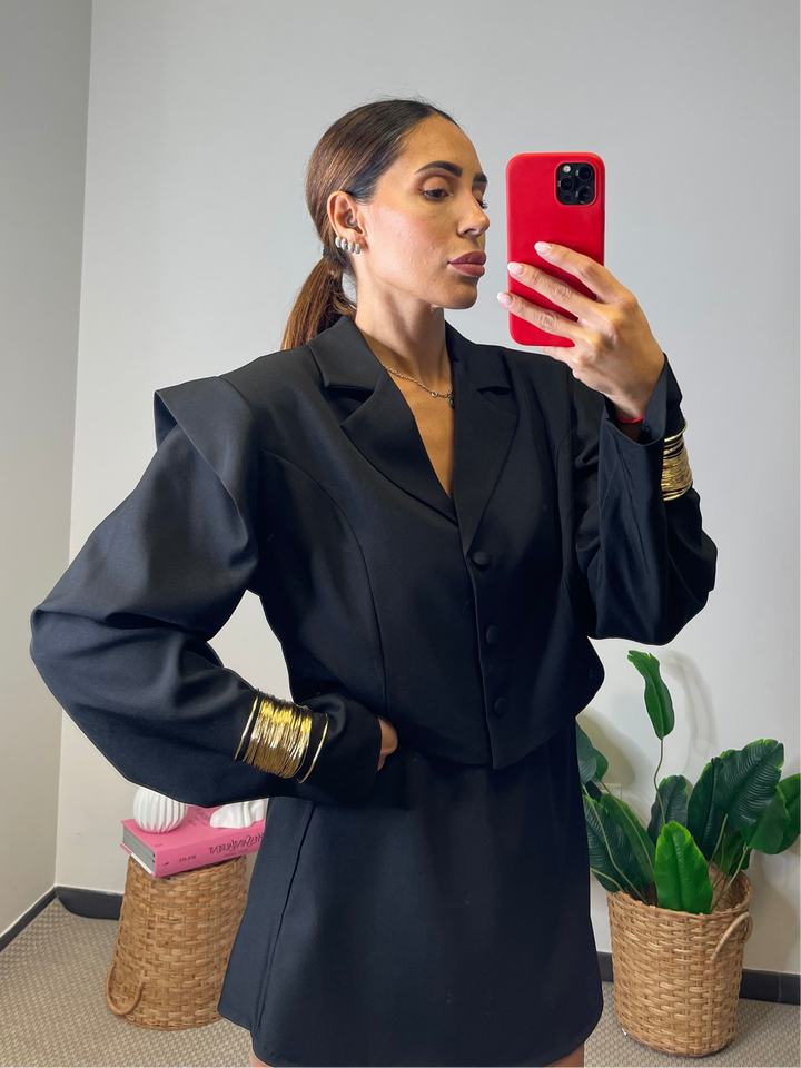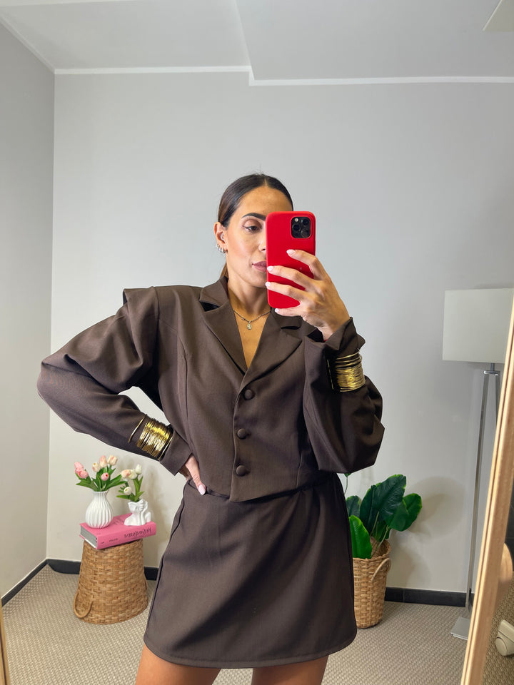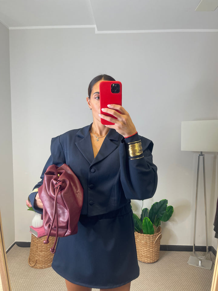 Coordinato con blazer con spalline imbottite e scese. Bottoncini apribili sul davanti.