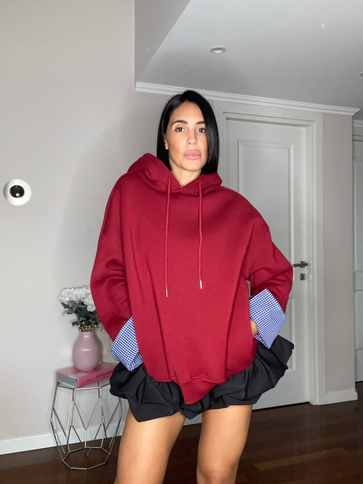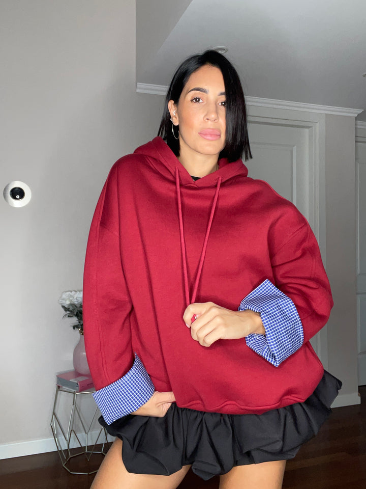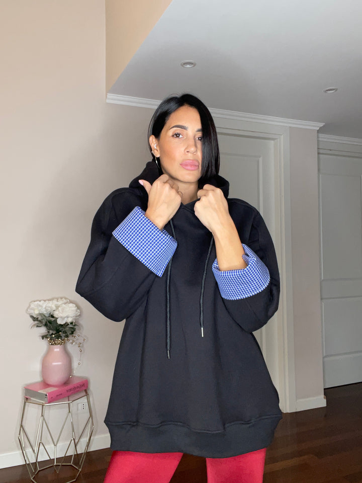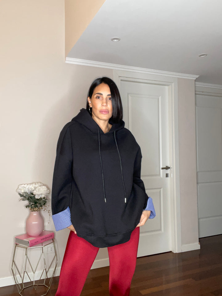 Felpa Lumina con cappuccio, taglio oversize, polso con particolarità risvolto camicia quadrettata. Tasche laterali.