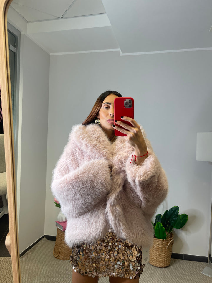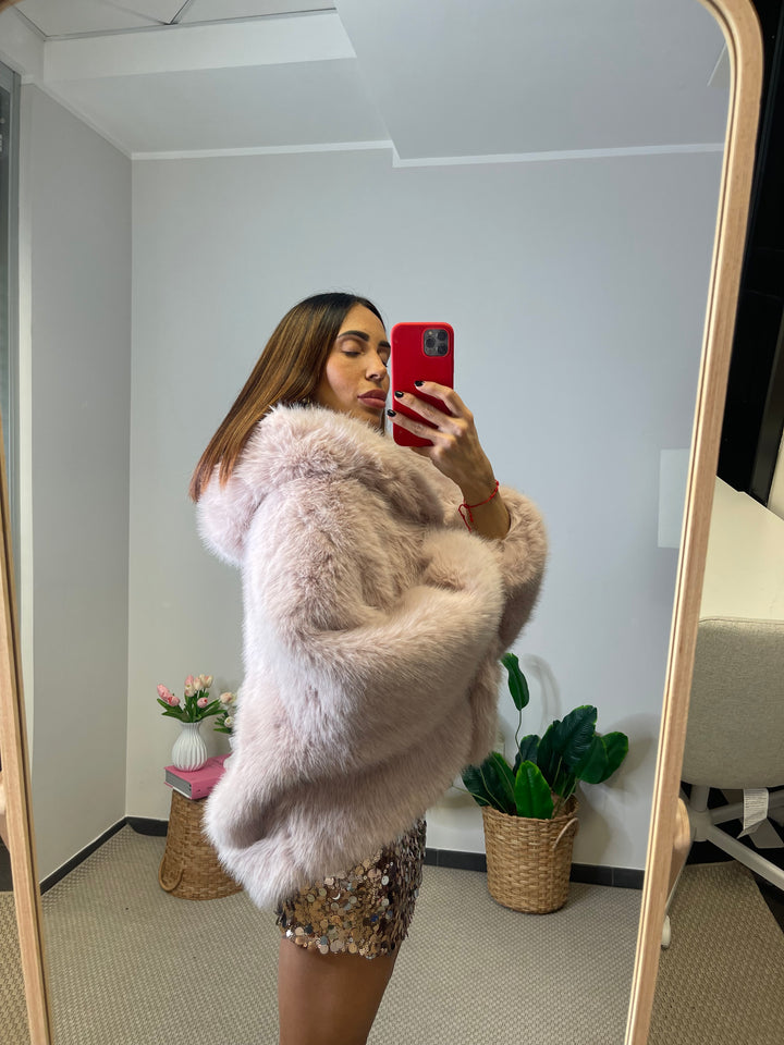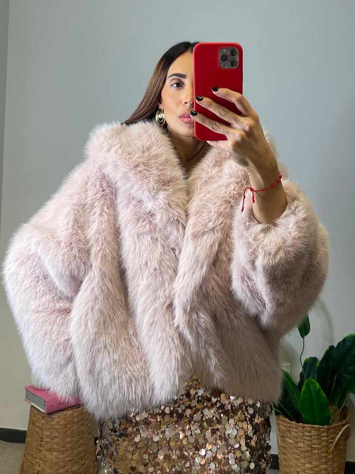 EcoFur Rosa foderata taglio asimmetrico (più lunga sul retro e corta sul davanti) con gancetto sul davanti per chiuderla.