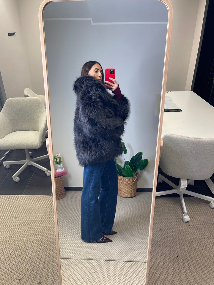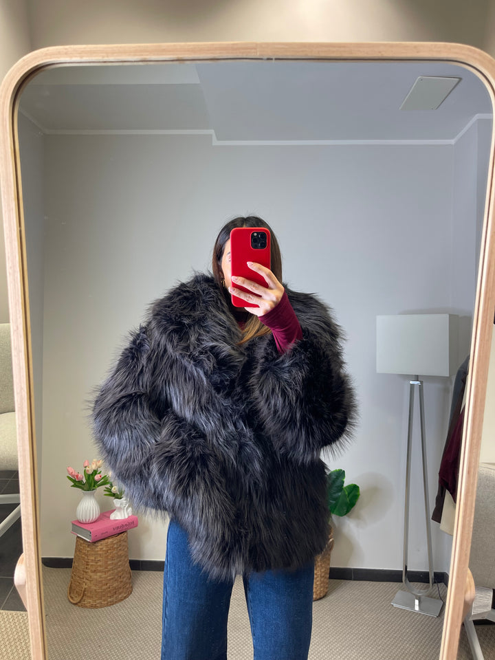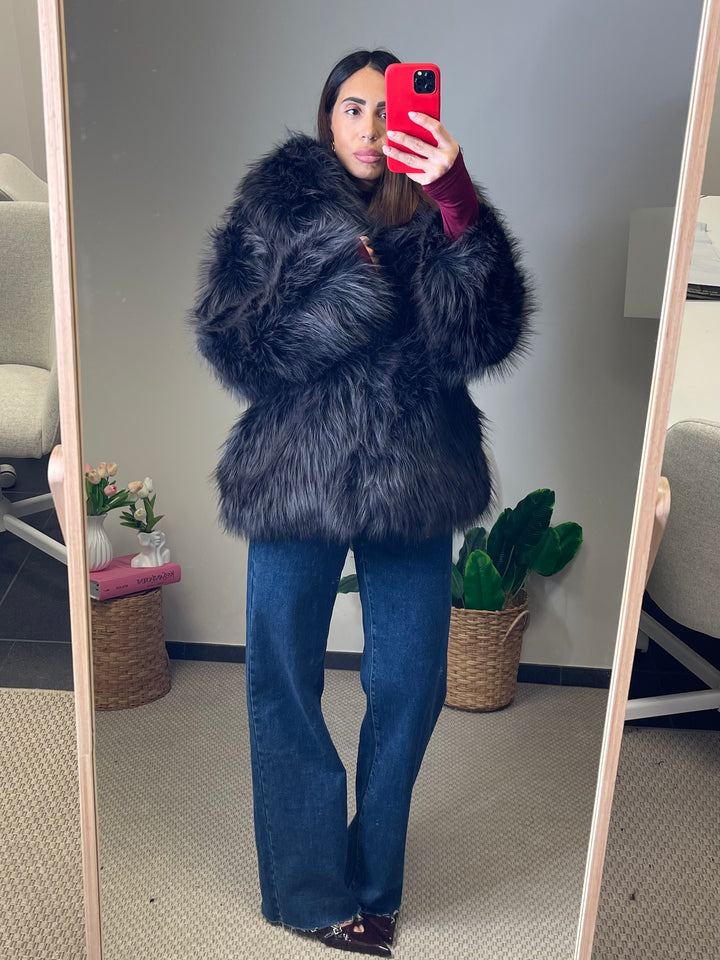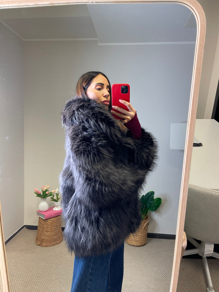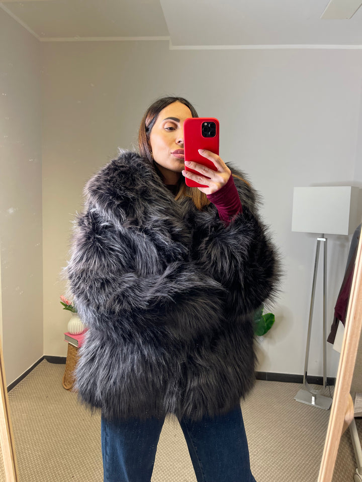 EcoFur Top Quality Grigio foderata super voluminosa con super collo, tasche laterali e tre gancetti sul davanti.