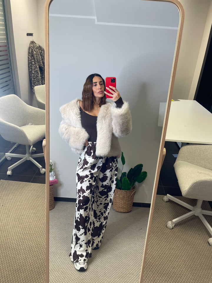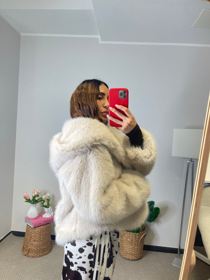 EcoFur Color Vaniglia foderata con gancetto sul davanti e tasche laterali con cappuccio sul retro.