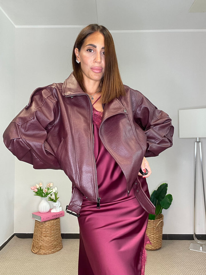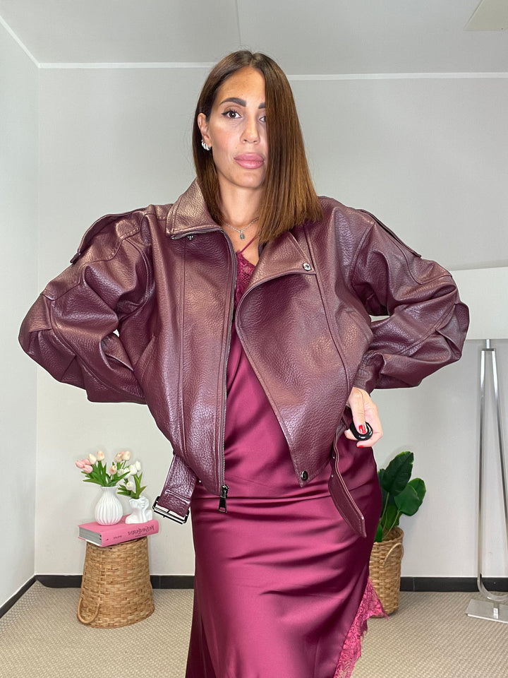 Giacca bomber in similpelle martellata con elastico in vita e cinturina.