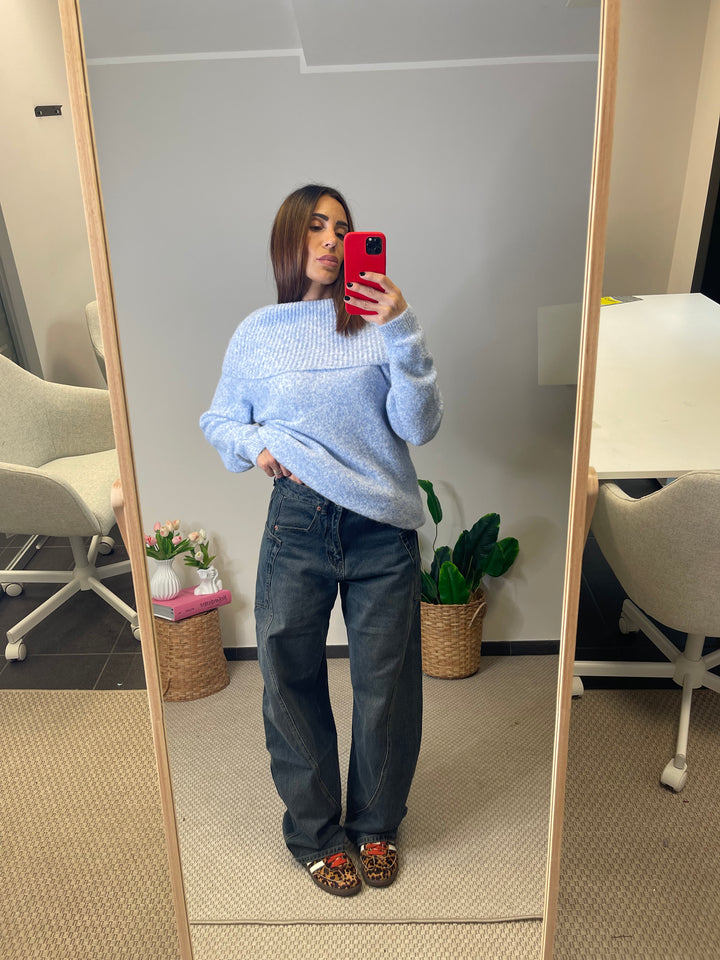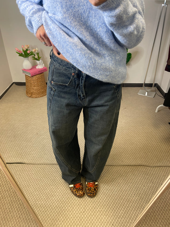 Jeans lavaggio scuro, tela morbida, vita bassa.