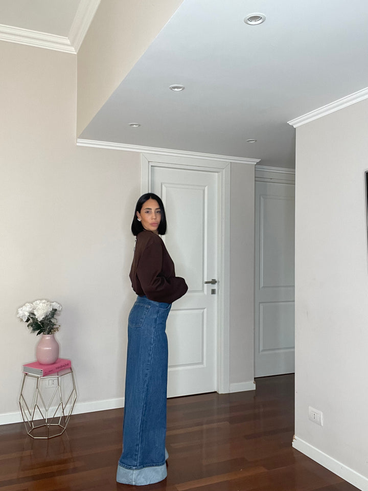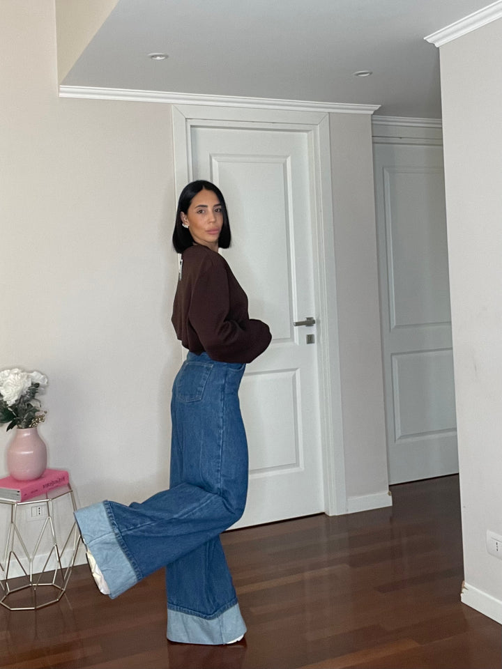 Jeans a vita altissima, leggermente elasticizzato. Piegone sul fondo.
