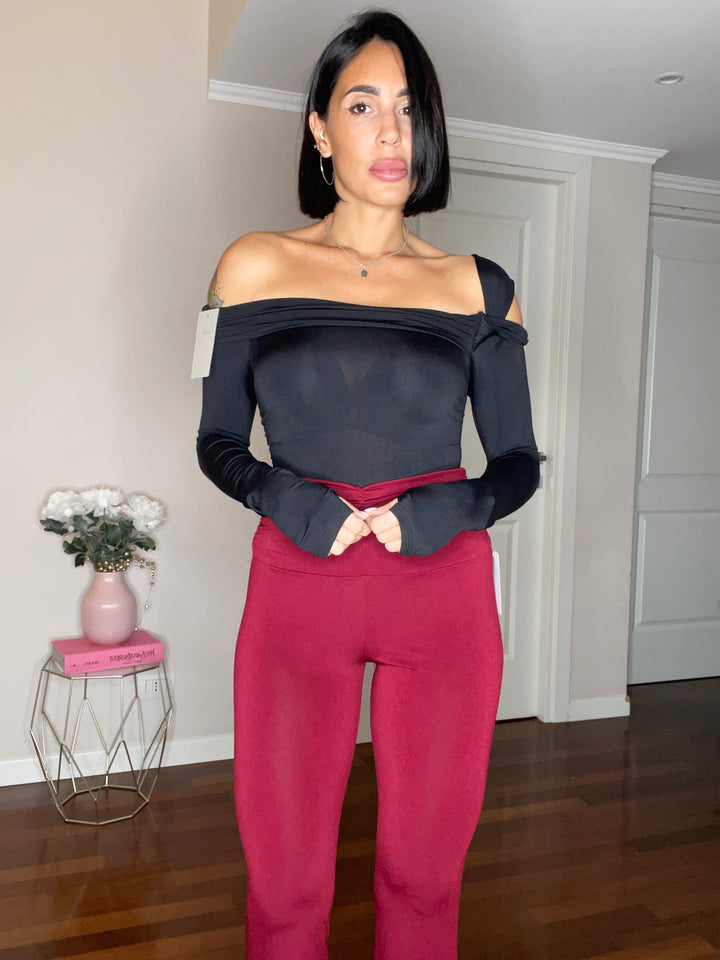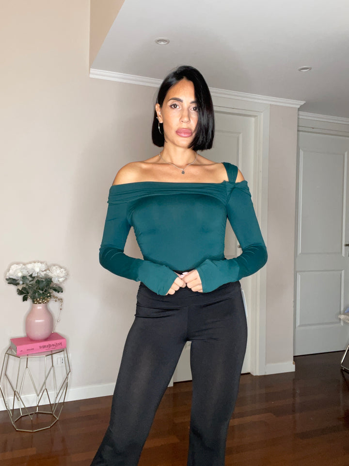 Maglia elasticizzata con scollo a barca e incrocio su spalla dx.