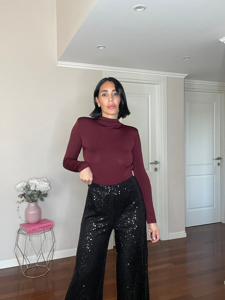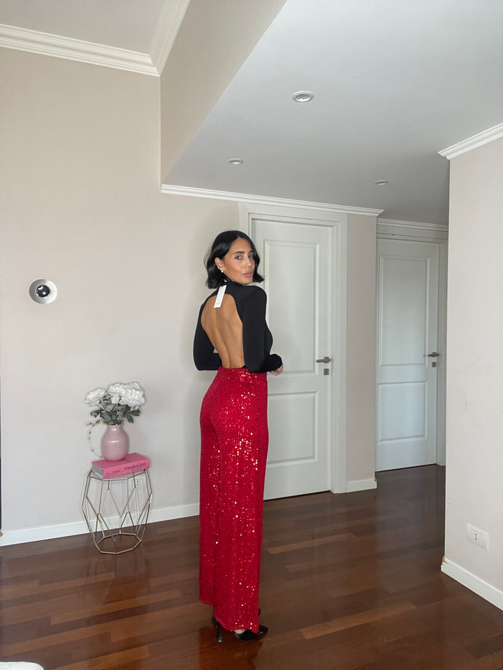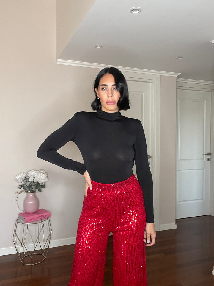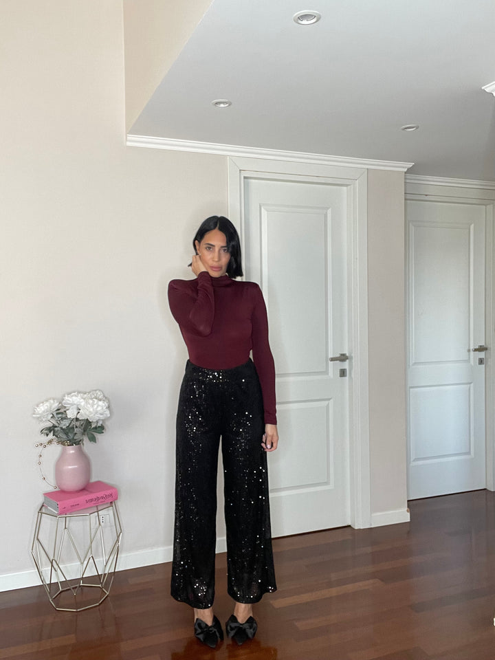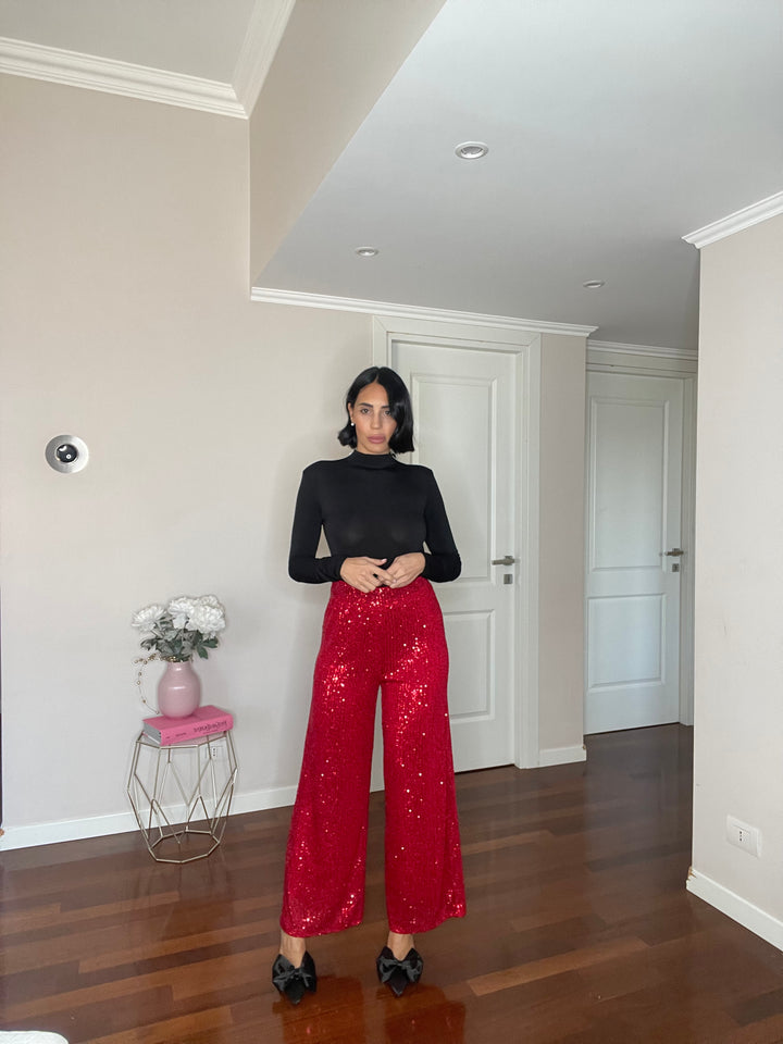 Pantalone a palazzo ricoperto di pailettes con elastico in vita.