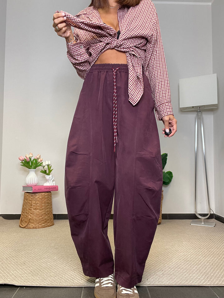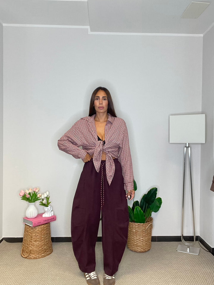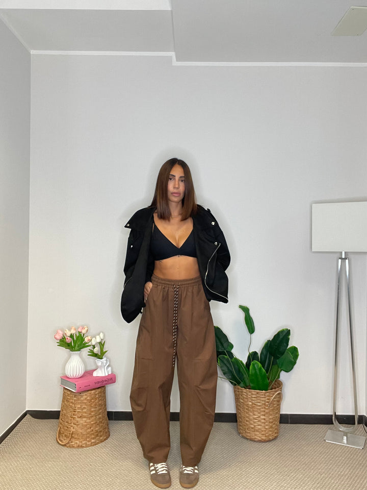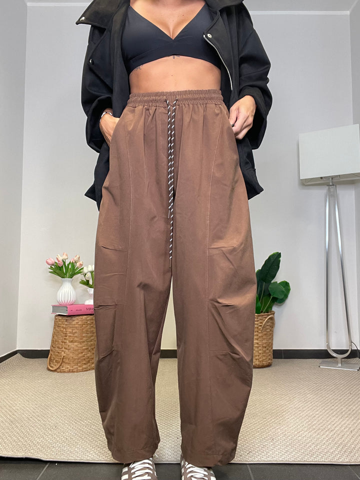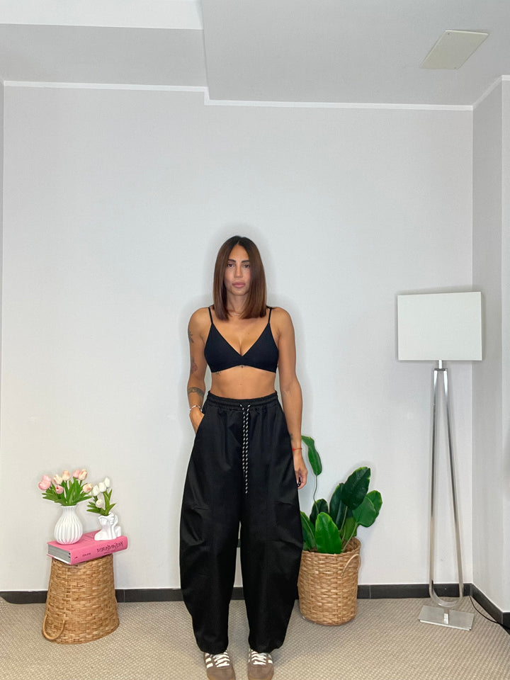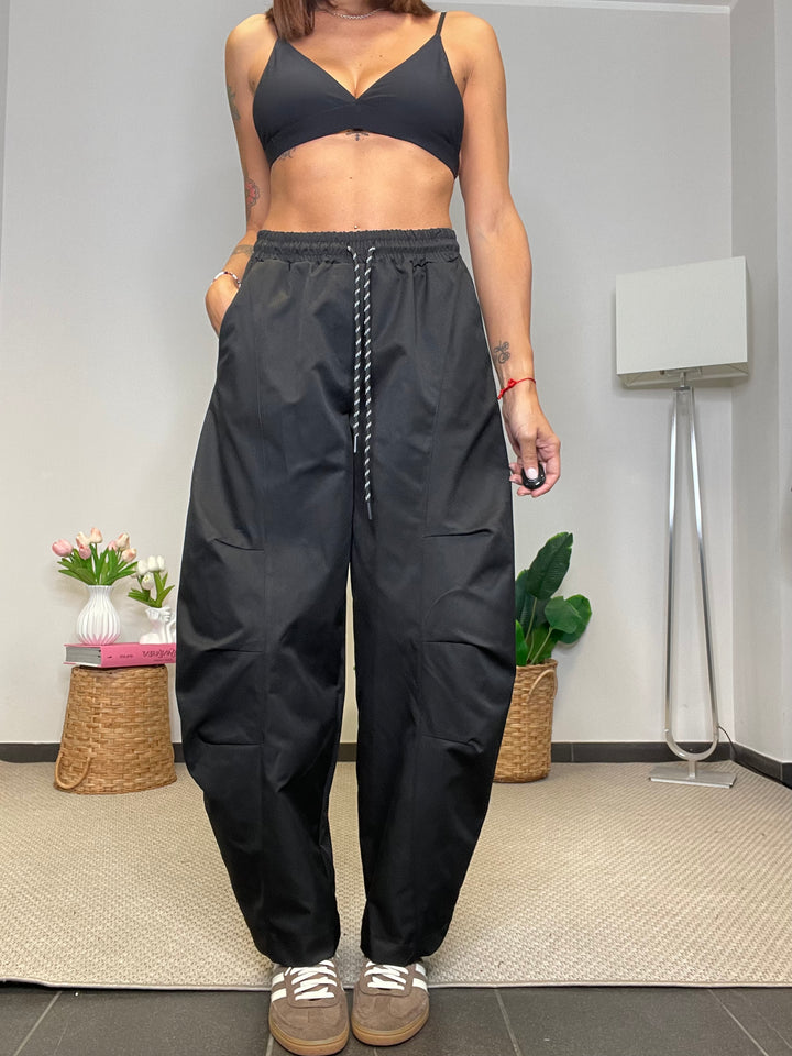 Pantalone in cotone pettinato (super bello) a gamba larga con elastico e laccio in vita. Gamba a Balloon.
