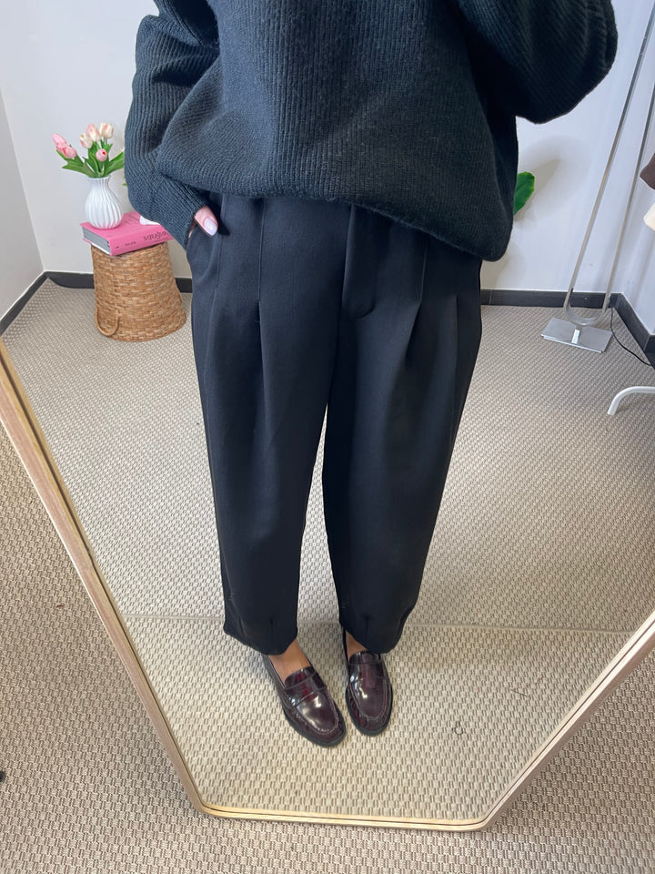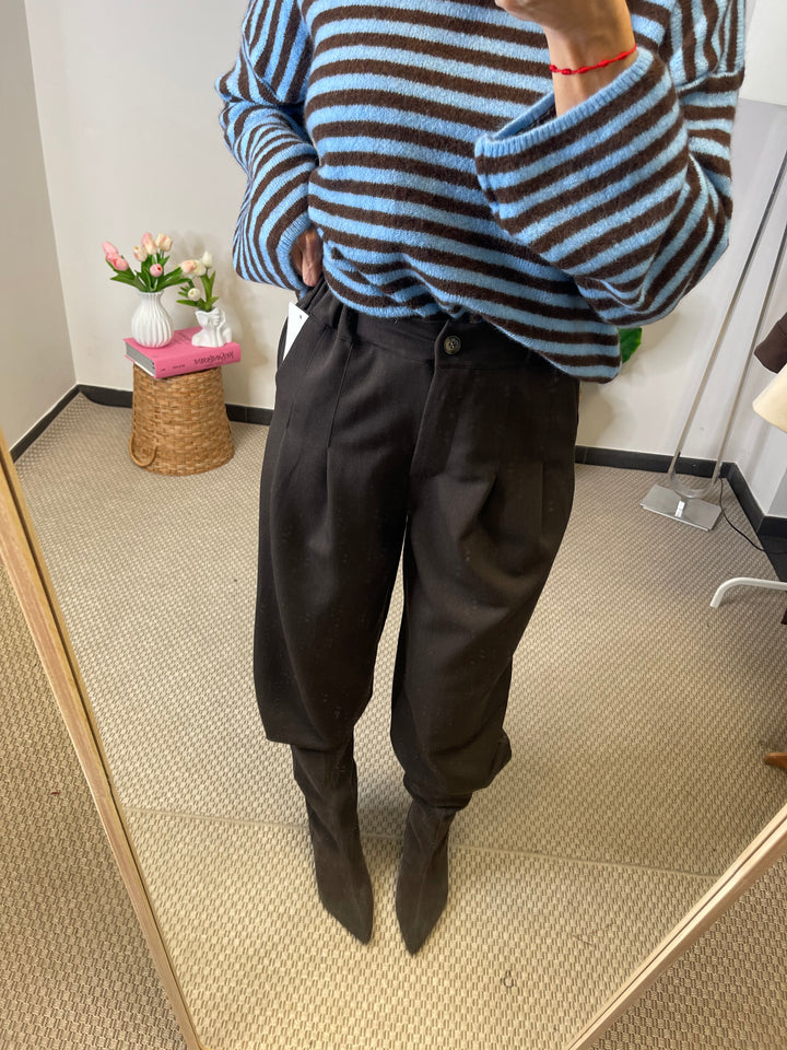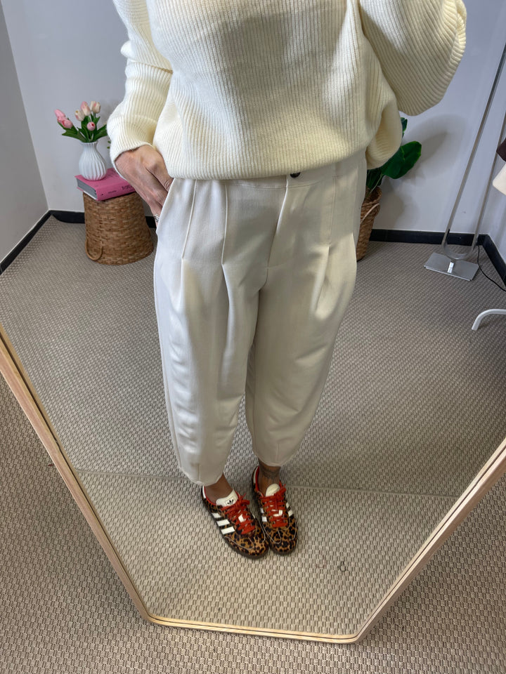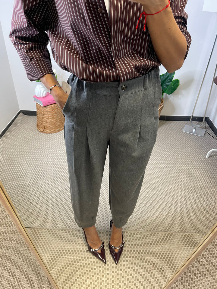 Pantalone con pences a gamba larga con tasche ai lati, bottone e zip sul davanti. Elastico sul retro.