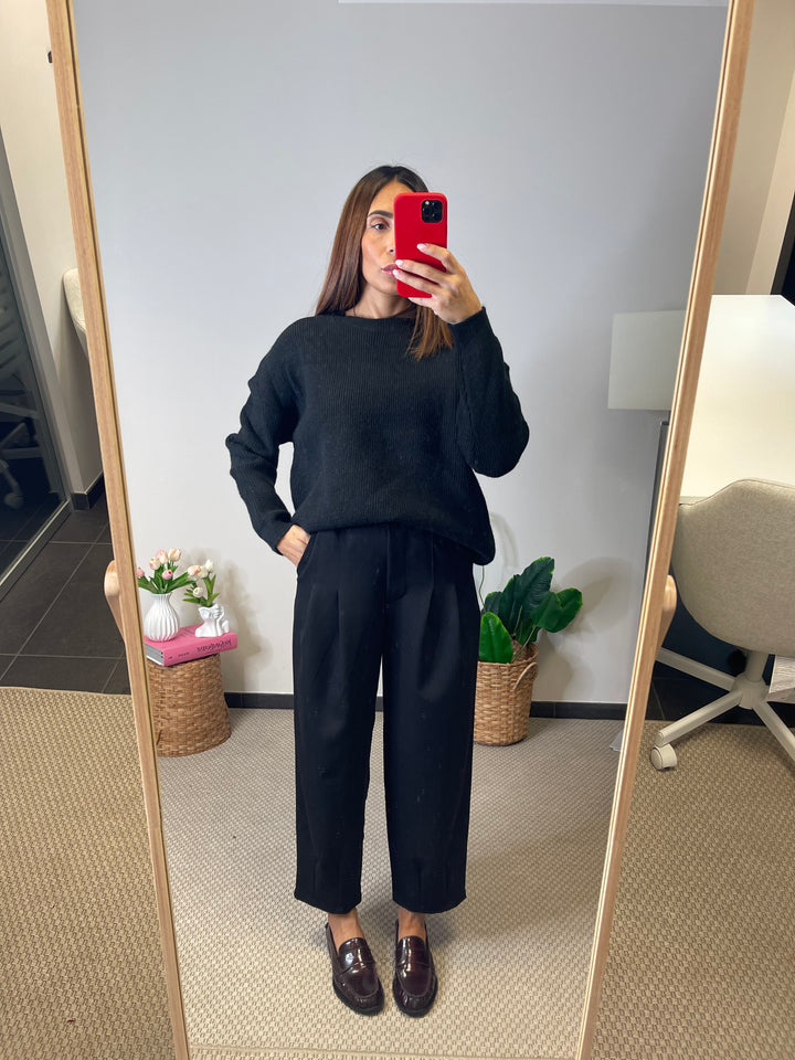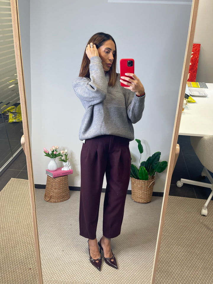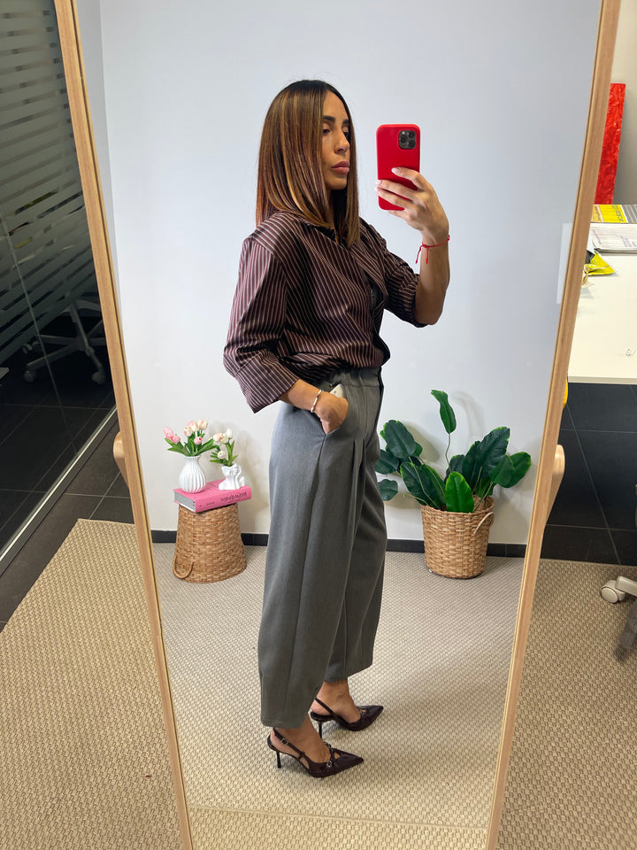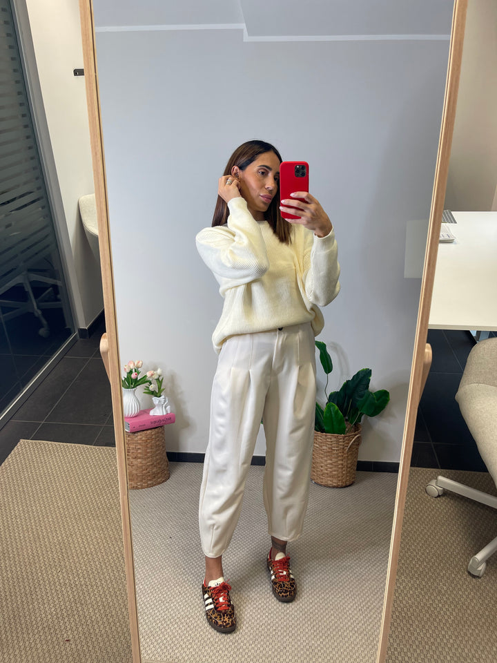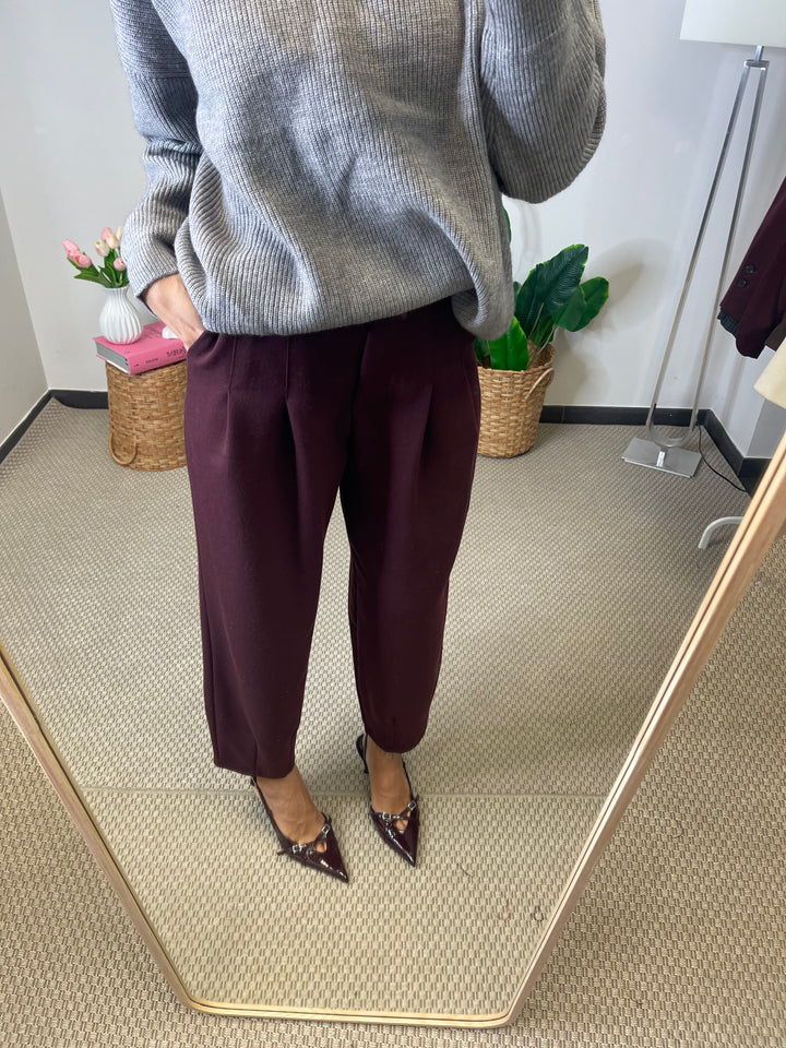 Pantalone con pences a gamba larga con tasche ai lati, bottone e zip sul davanti. Elastico sul retro.