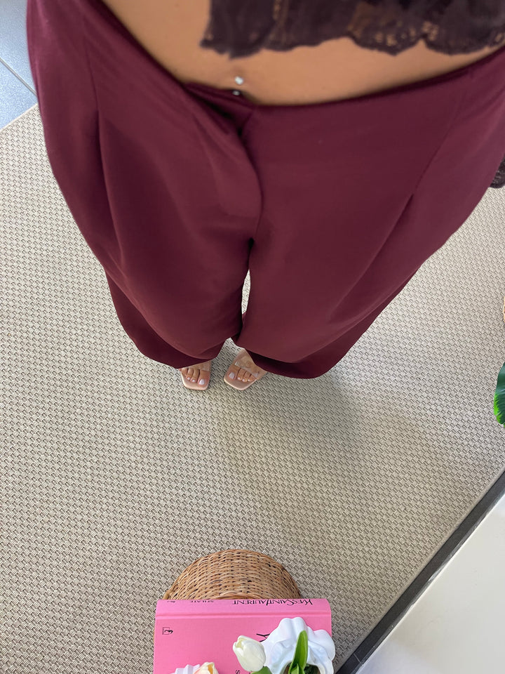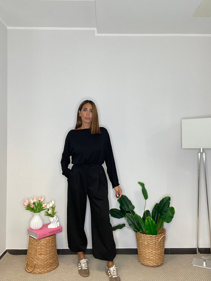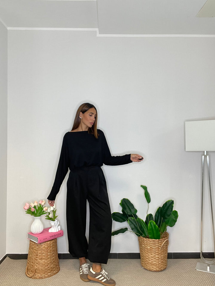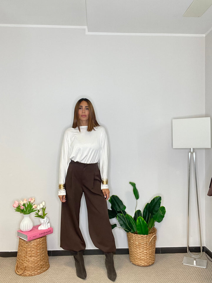 Pantalone a gamba larga con elastico sul retro e in fondo alla caviglia.