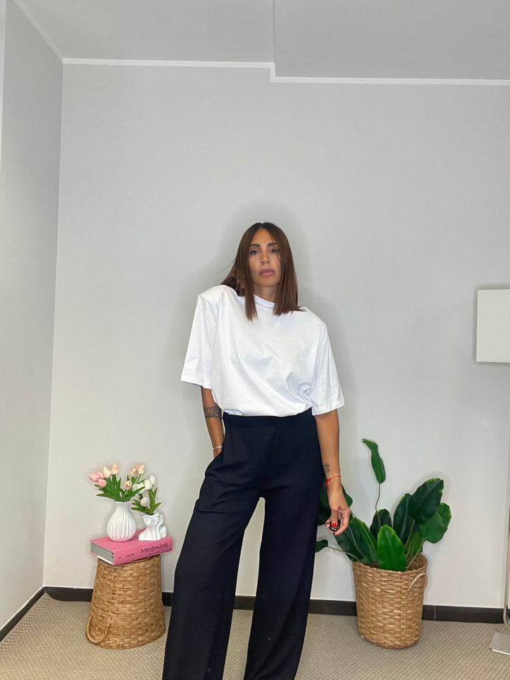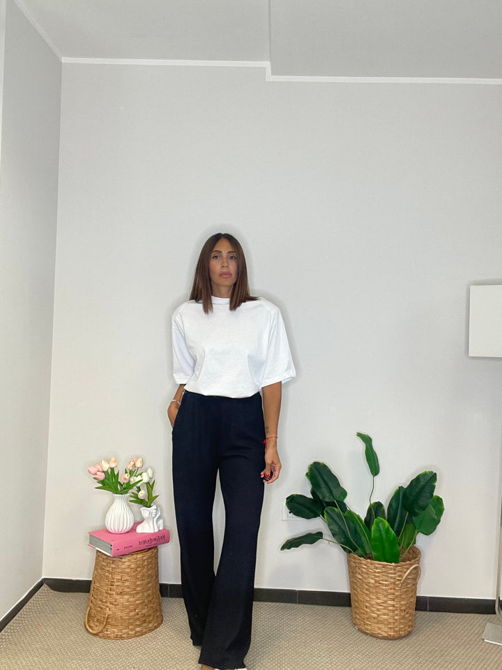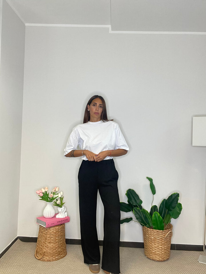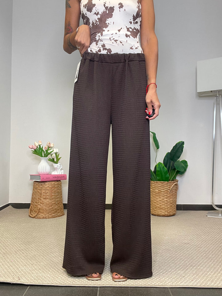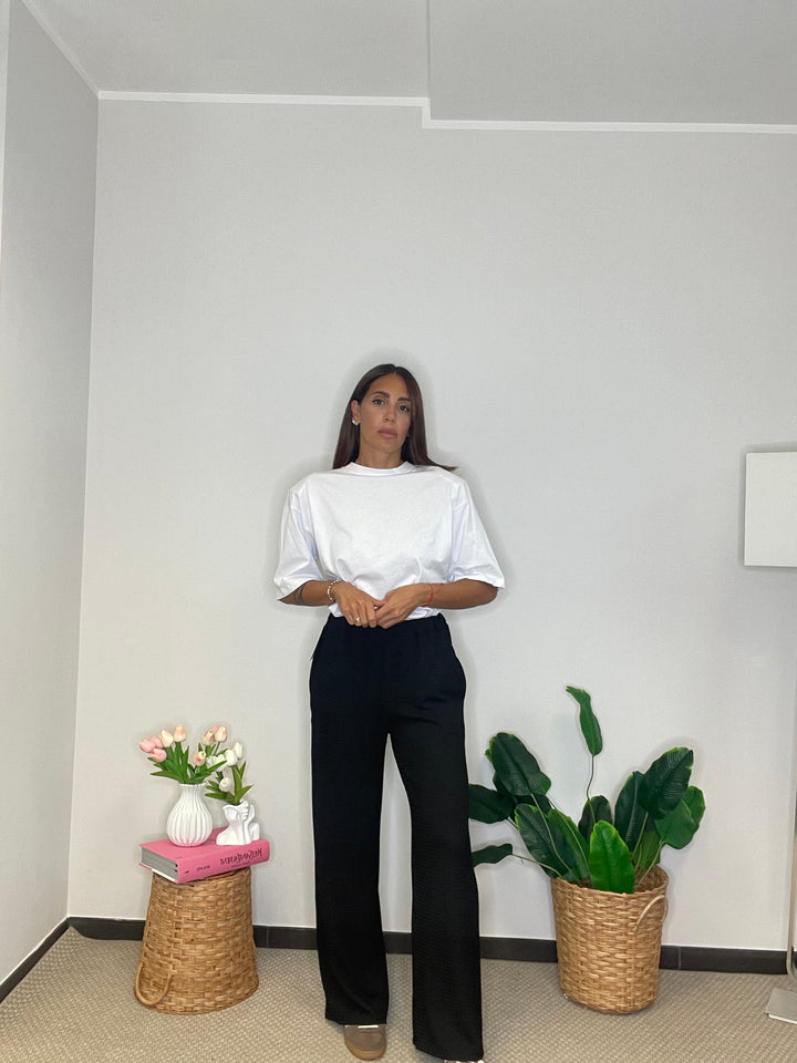 Pantalone super versatile e adatto a tutte le fisicità, taglia unica. Elastico in vita a gamba larga, veste fino ad una taglia 46.