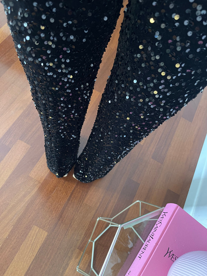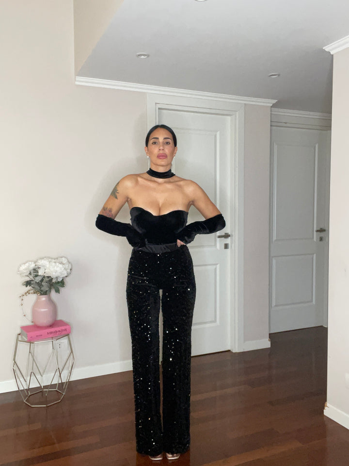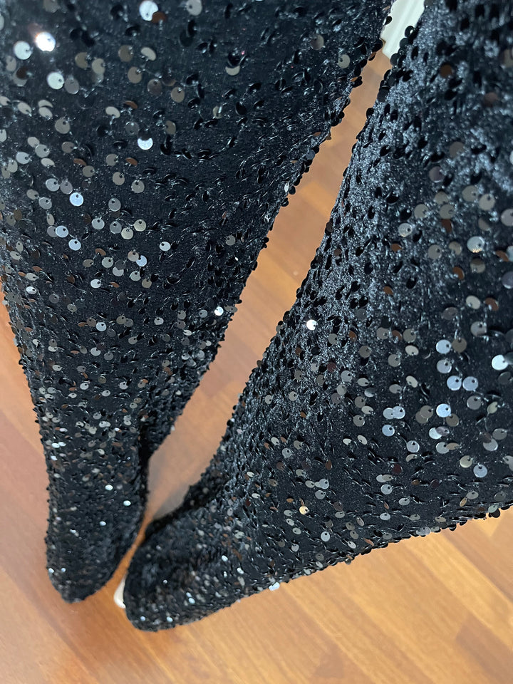 Pantalone in velluto e pailettes con elastico in raso in vita, taglia unica.