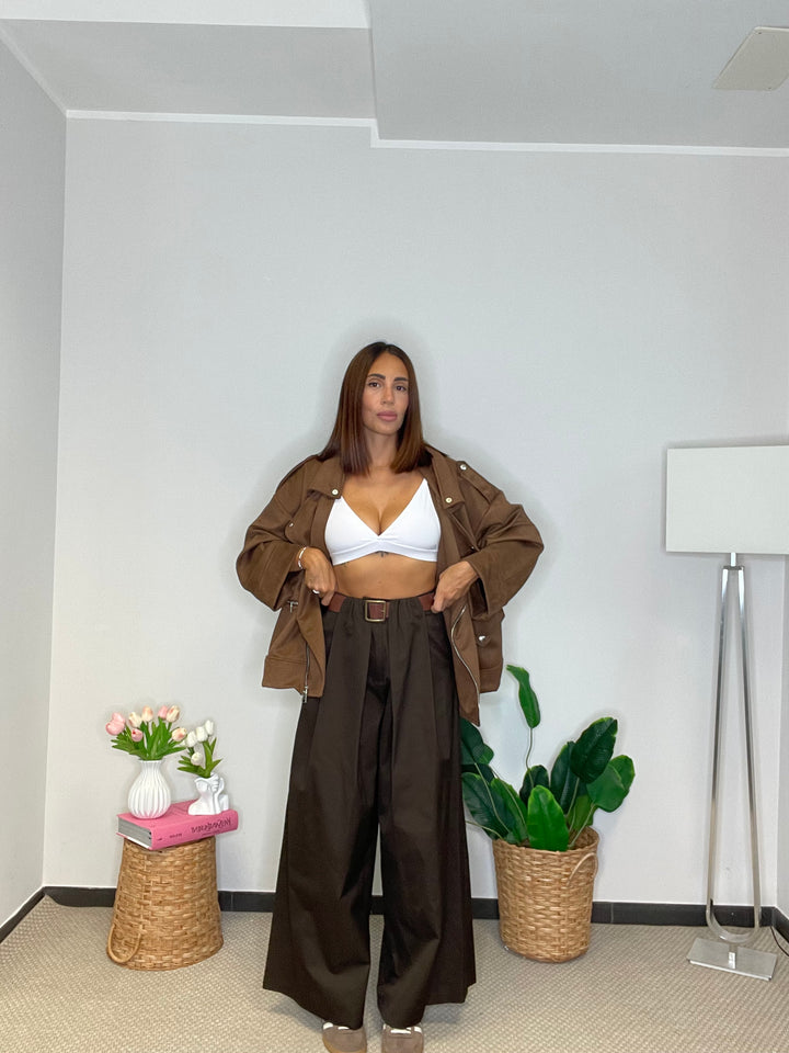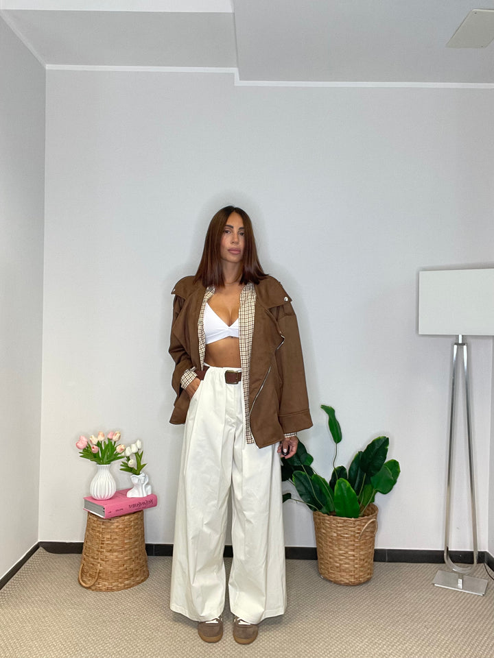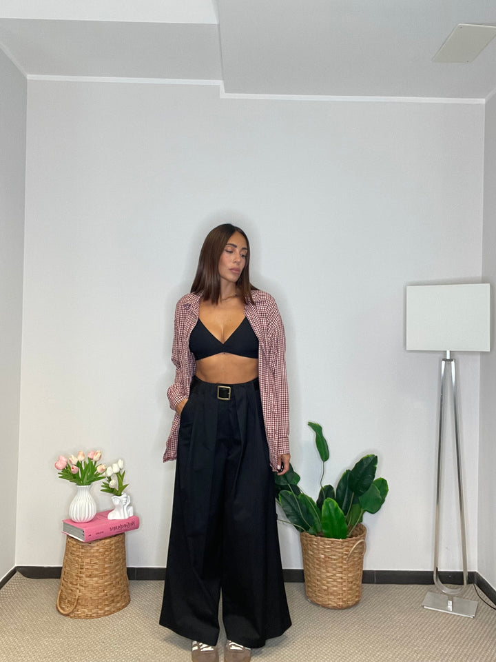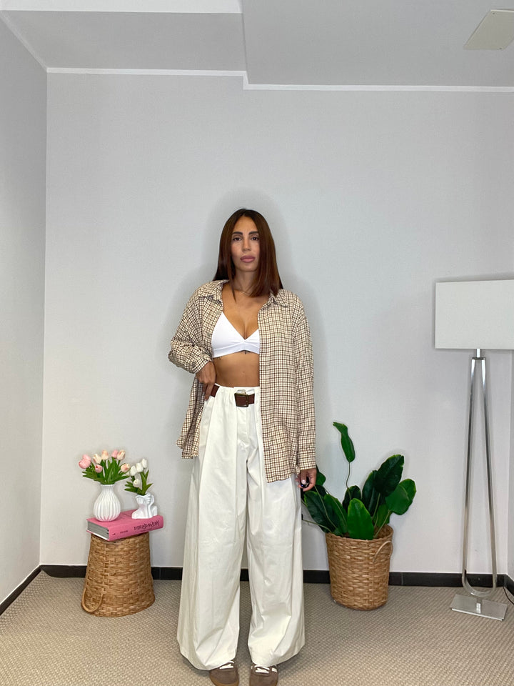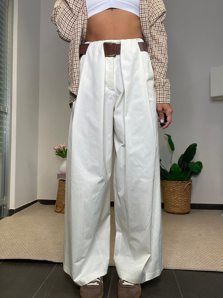 Pantalone a gamba larga in cotone pesante con elastico sul retro e cinturina inclusa.