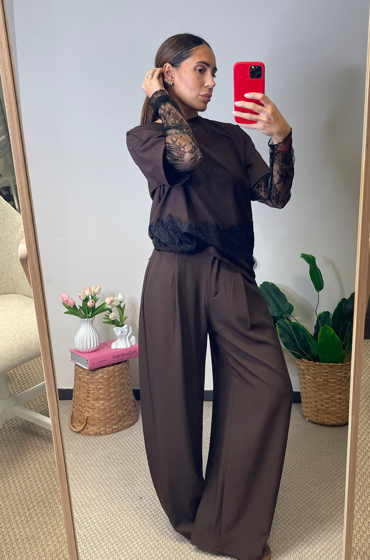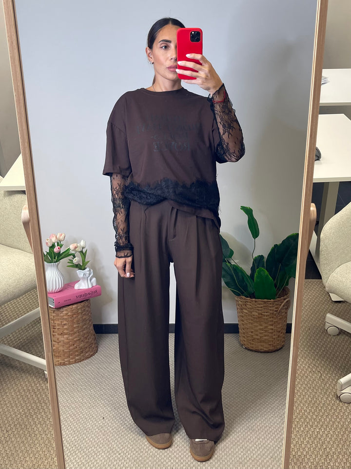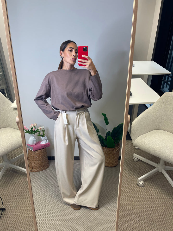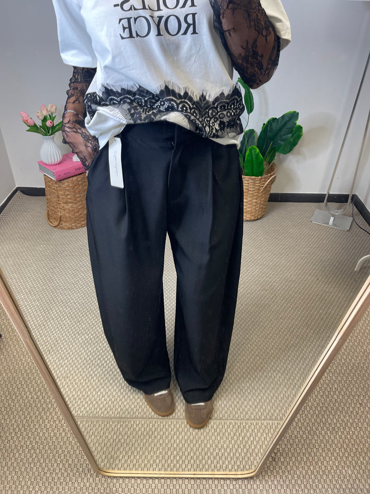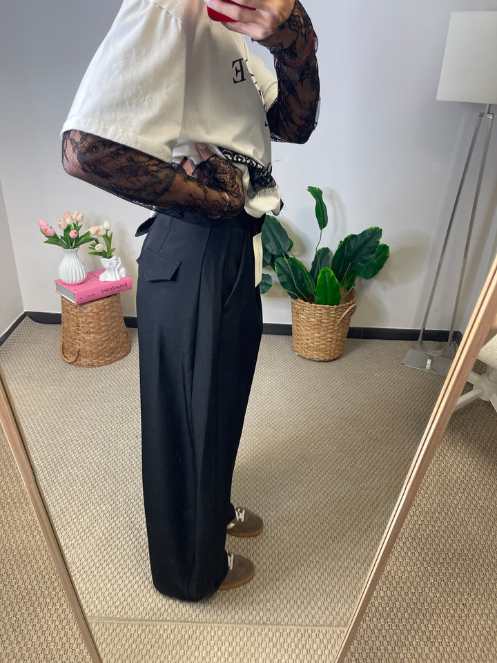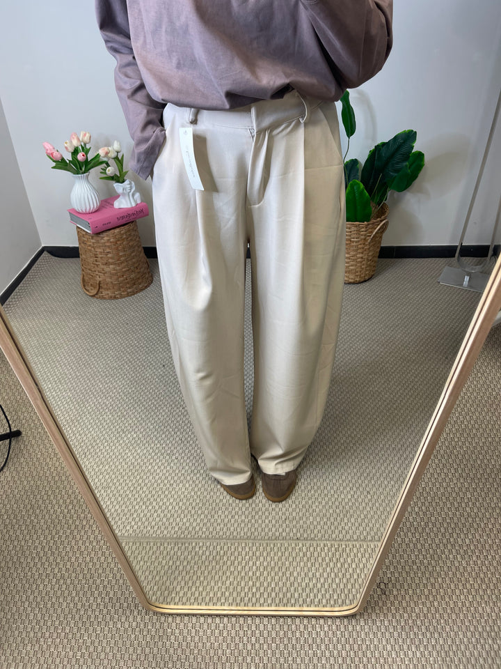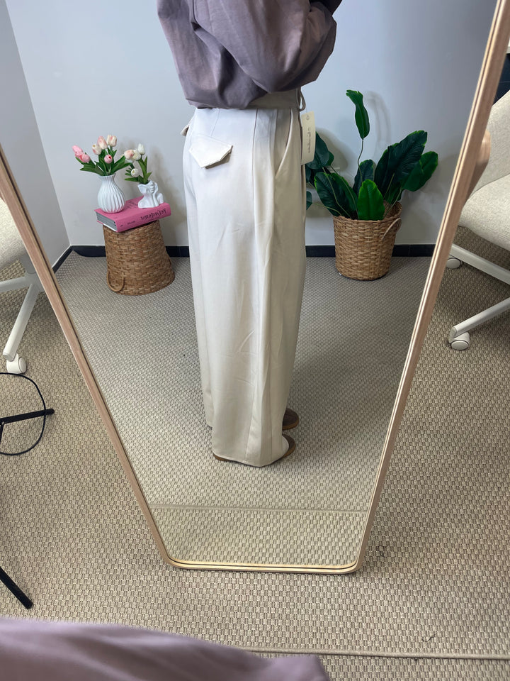 Pantalone taglio uomo a gamba larga con tasche ai lati, e bottone nascosto.