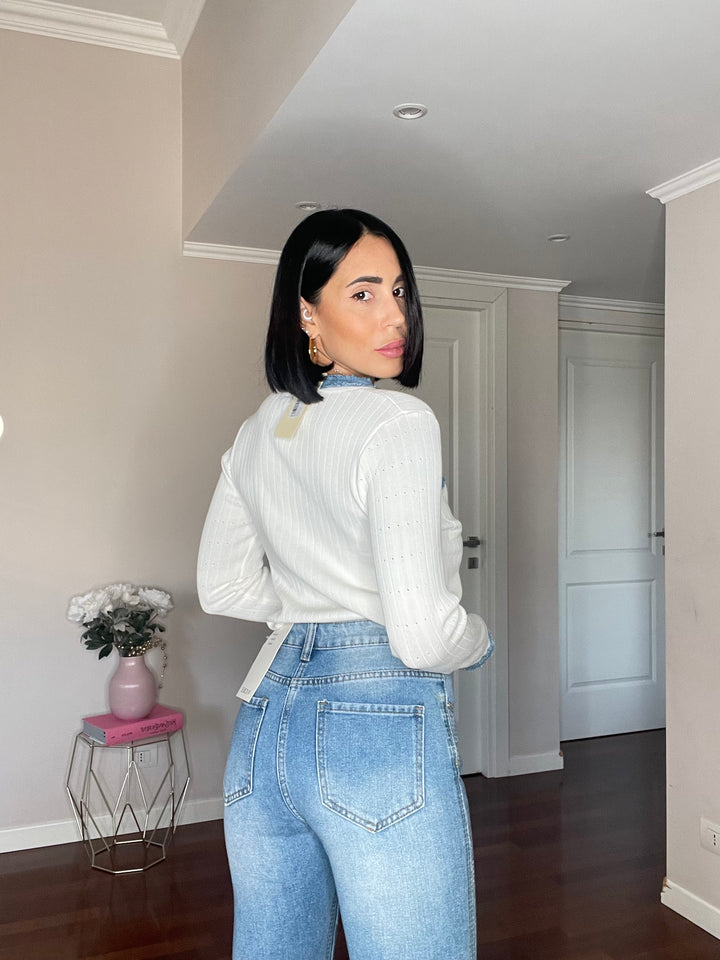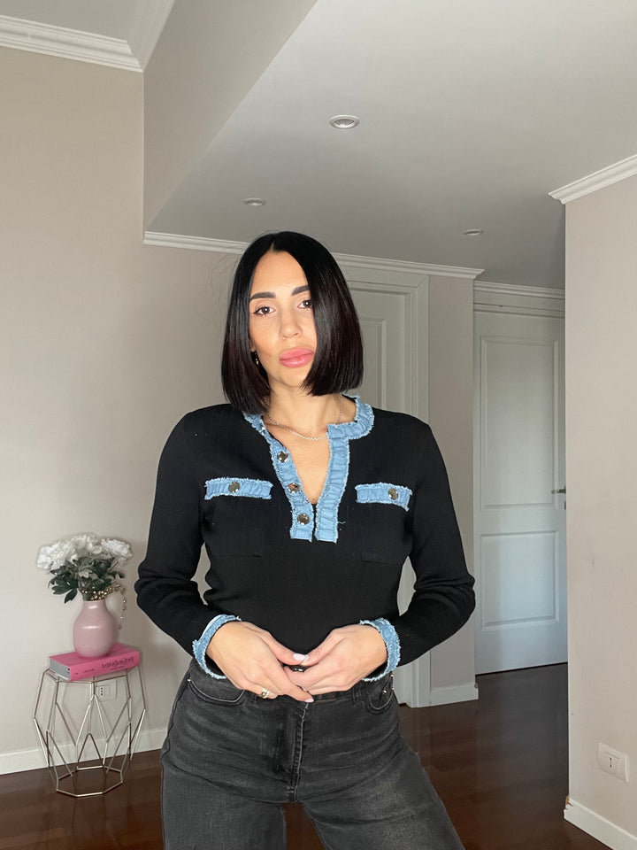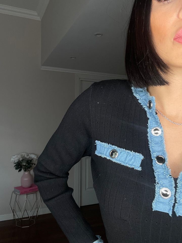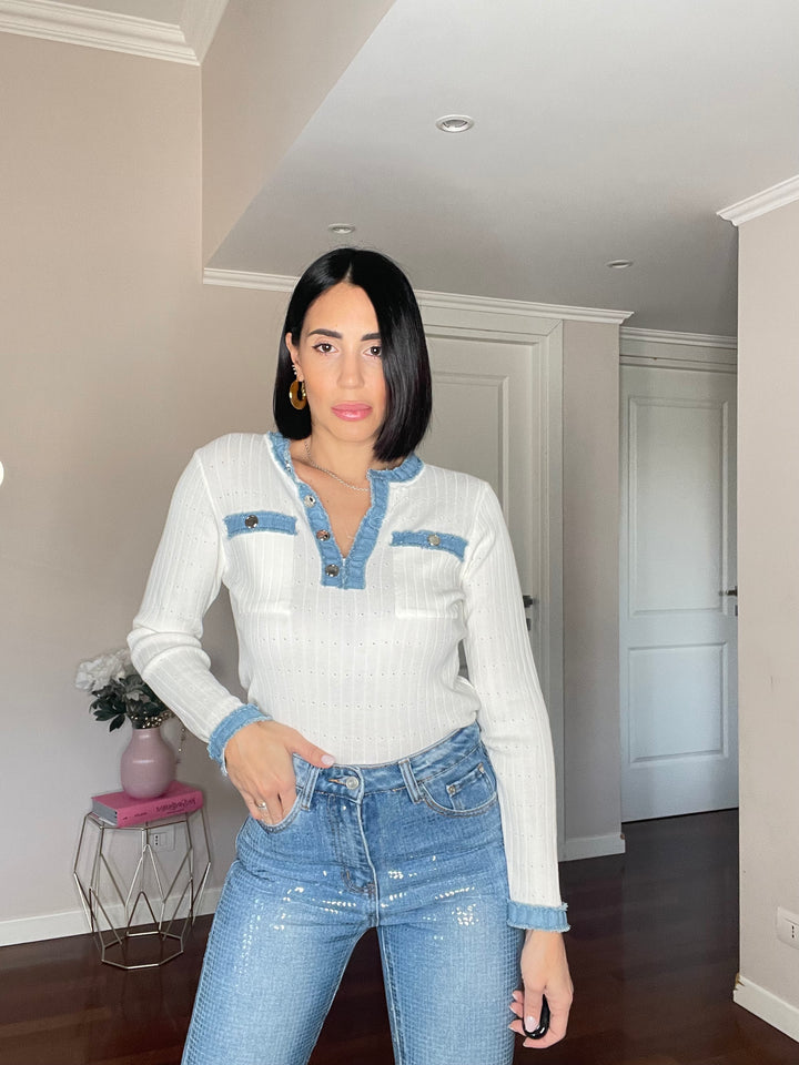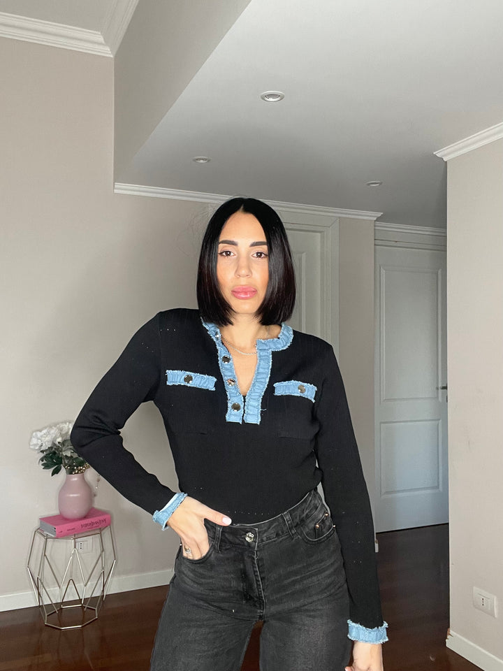 Pull in cotone ricamato con dettagli in jeans su collo, polsi e petto.