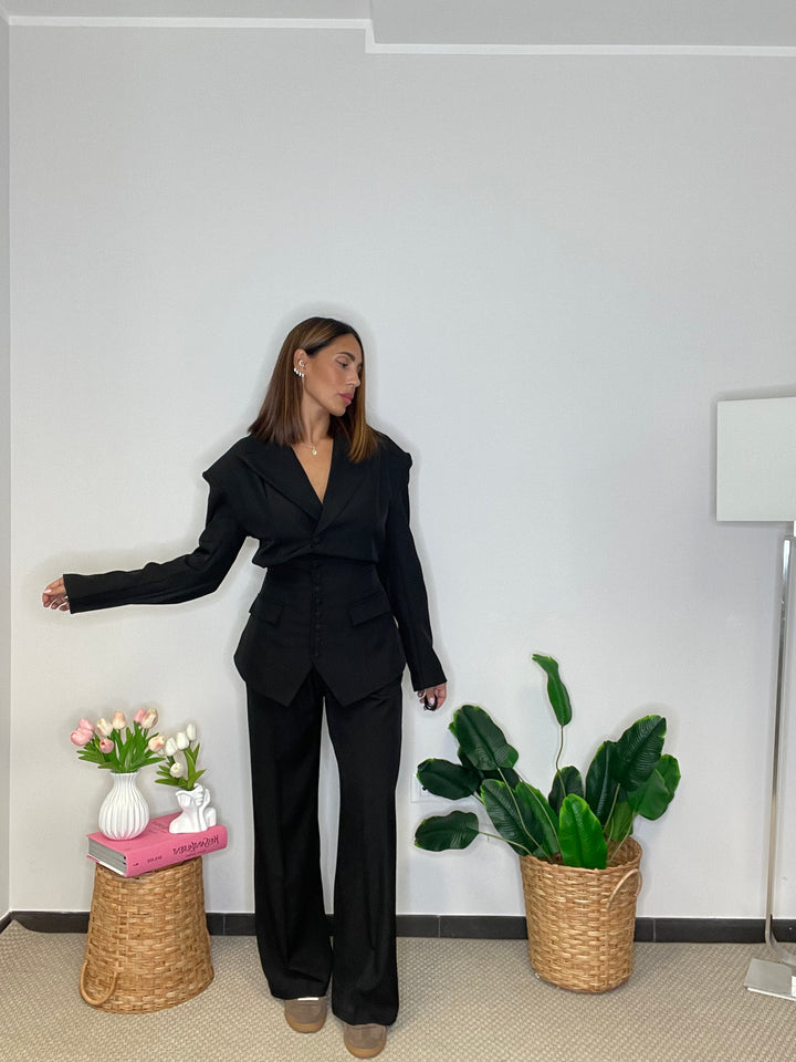 giacca con spalline imbottite ad effetto sceso con un solo bottone sul davanti;