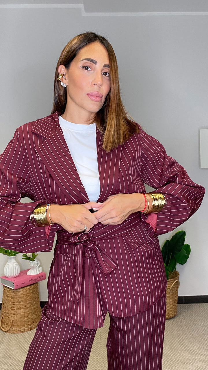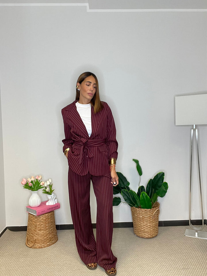 Coordinato gessato composto da blazer monopetto e pantalone.
