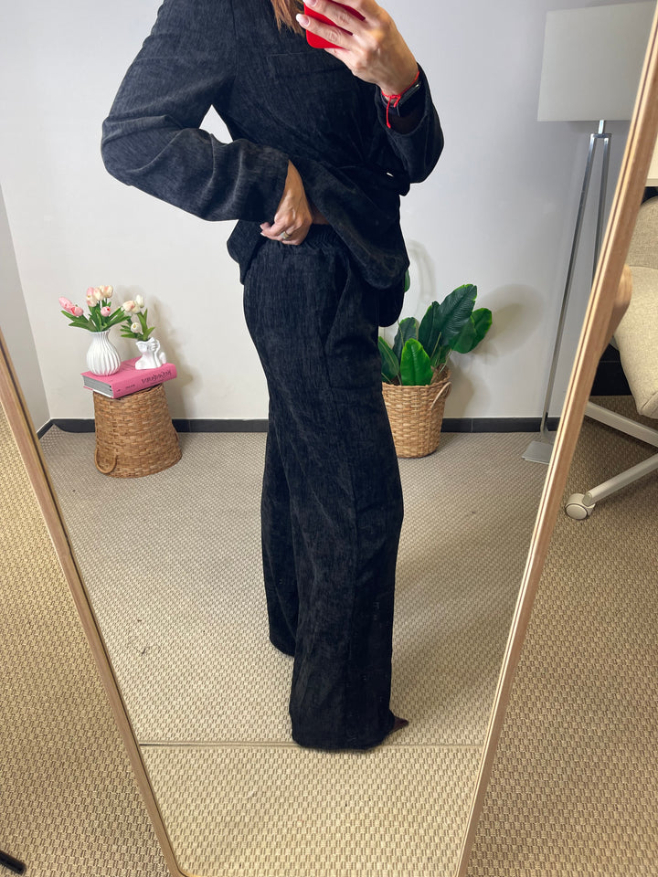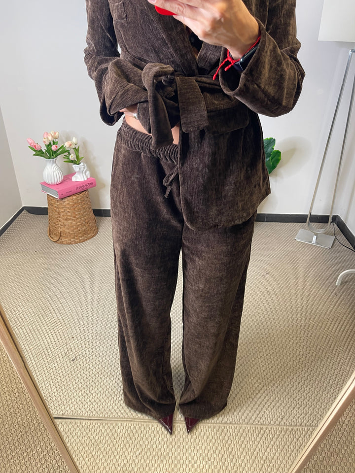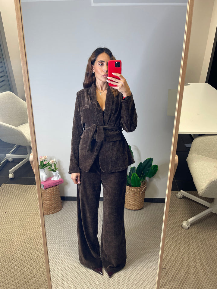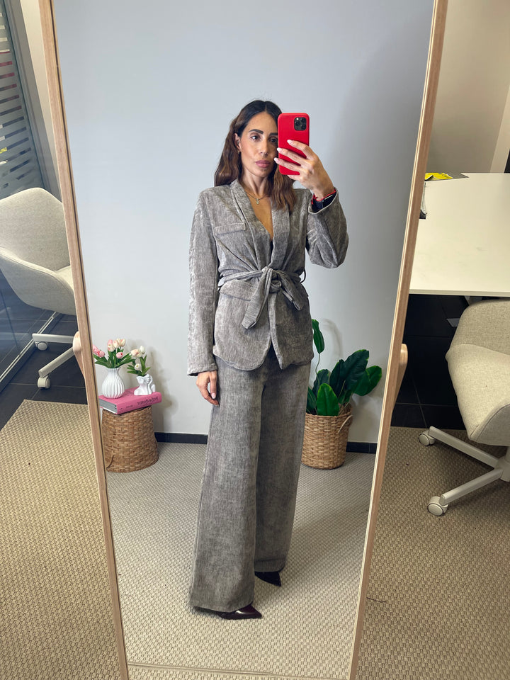 Tailleur composto da giacca con spalline e cintura in vita e pantalone con elastico e laccetto in vita. Tasche laterali.