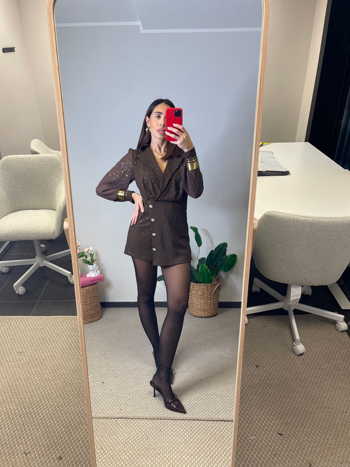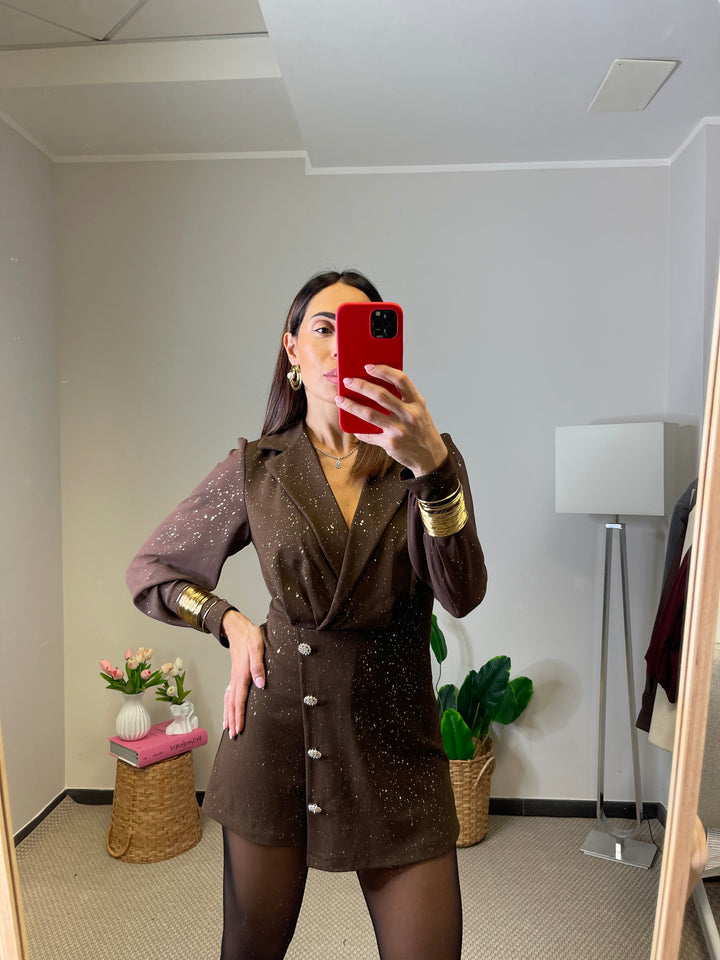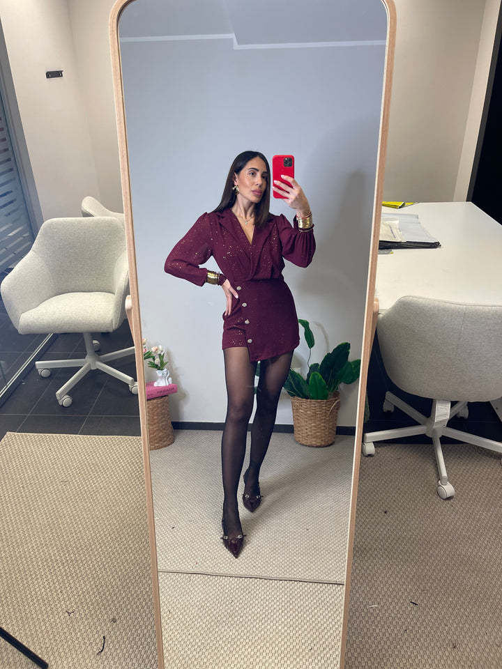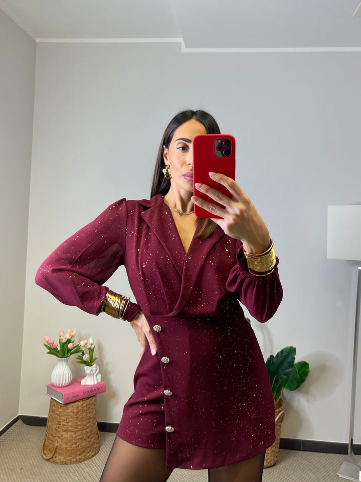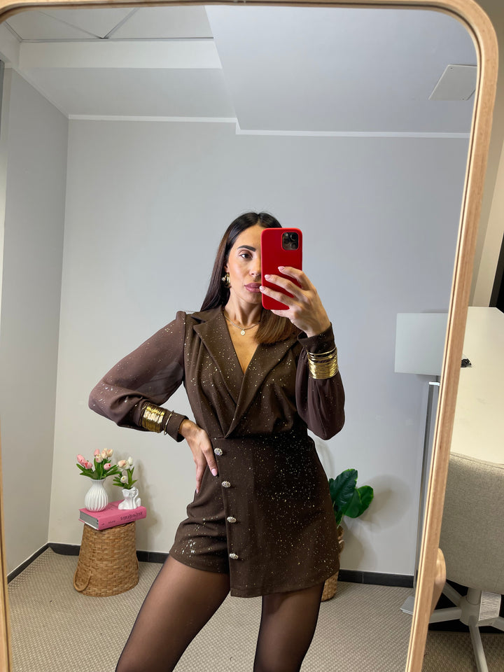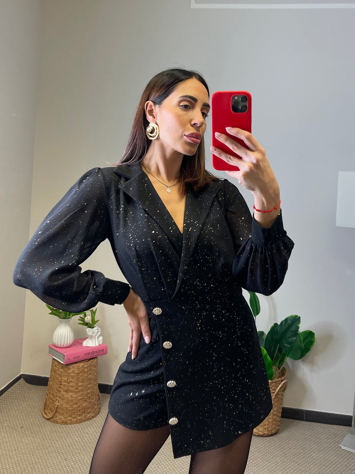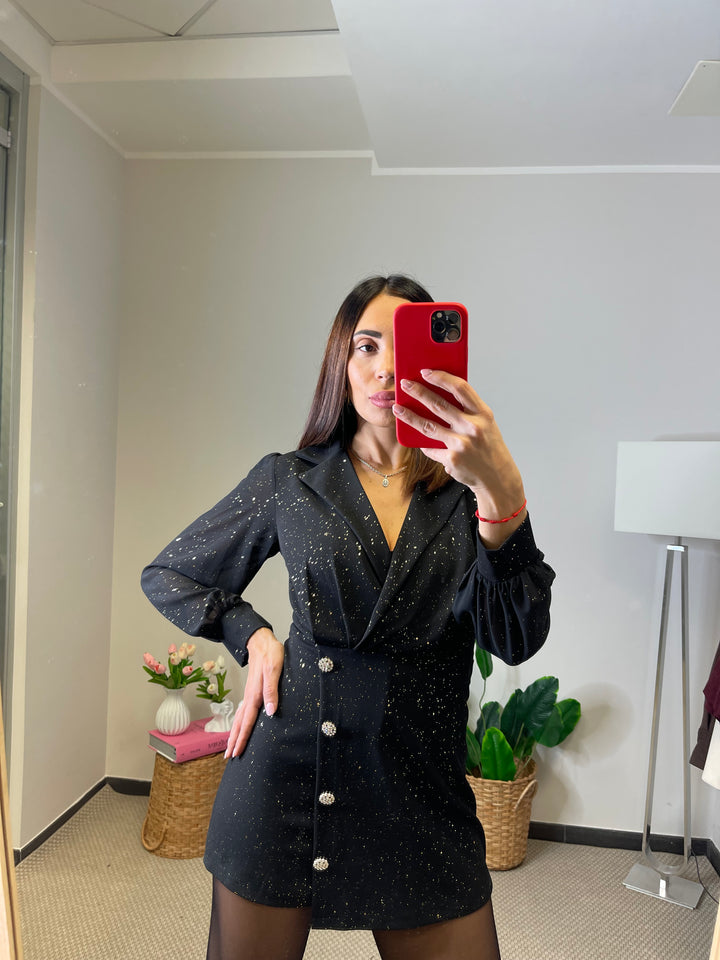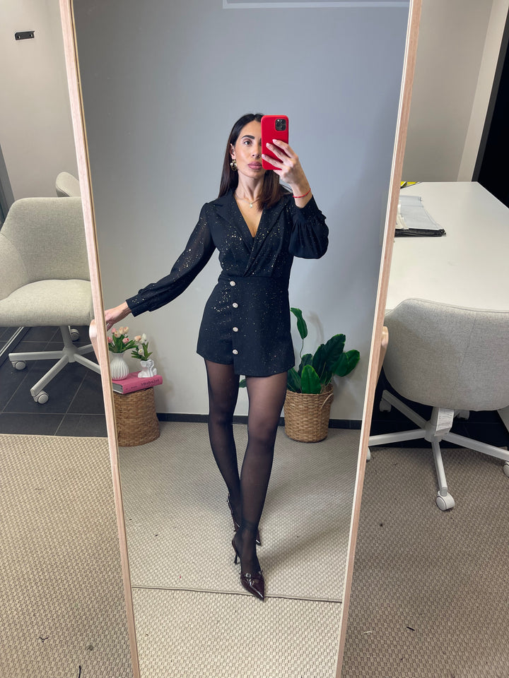 Tutina con glitter, elastico in vita e pantaloncino sul retro e gonna sul davanti con bottoncini gioiello.