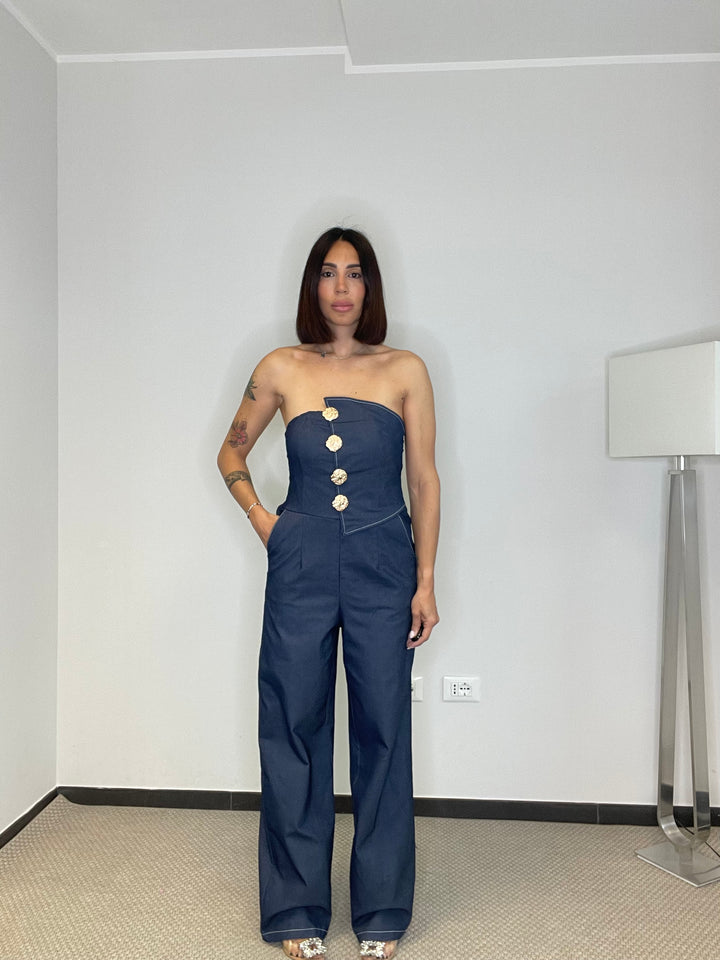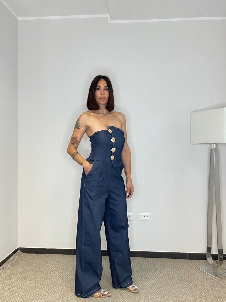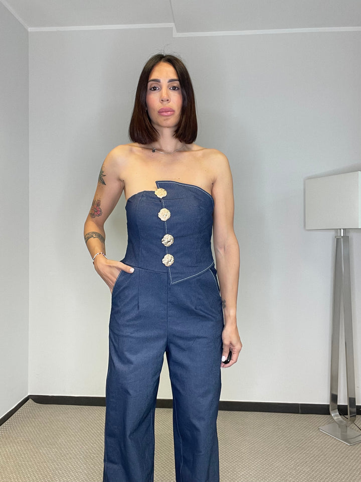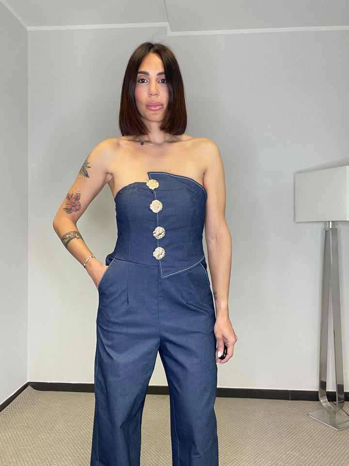 Tuta in Denim super morbido con bottoni oro sulla parte superiore. Non apribili. Coppe imbottite all’interno e fascia elastica sul retro.