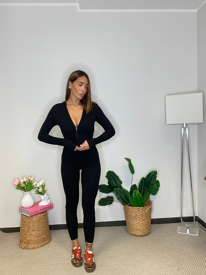 Tuta super elastica a costine, fasciante e contenitiva con zip sul davanti.